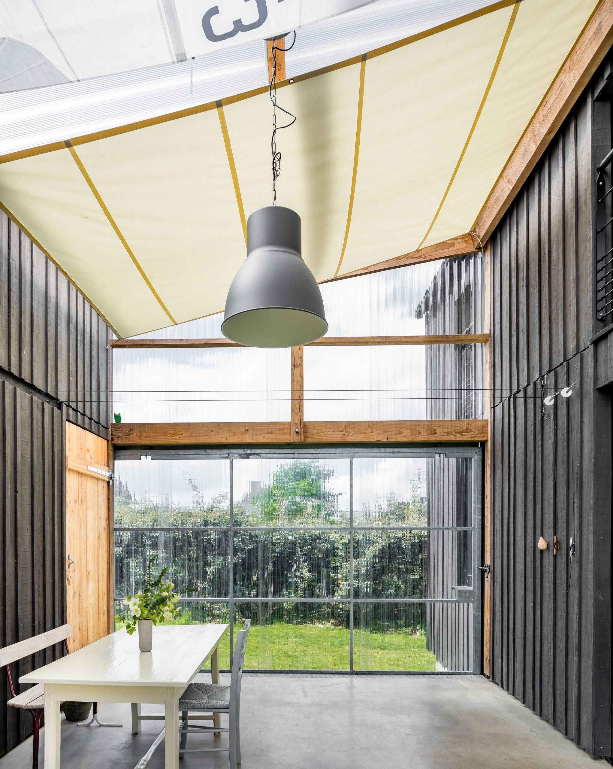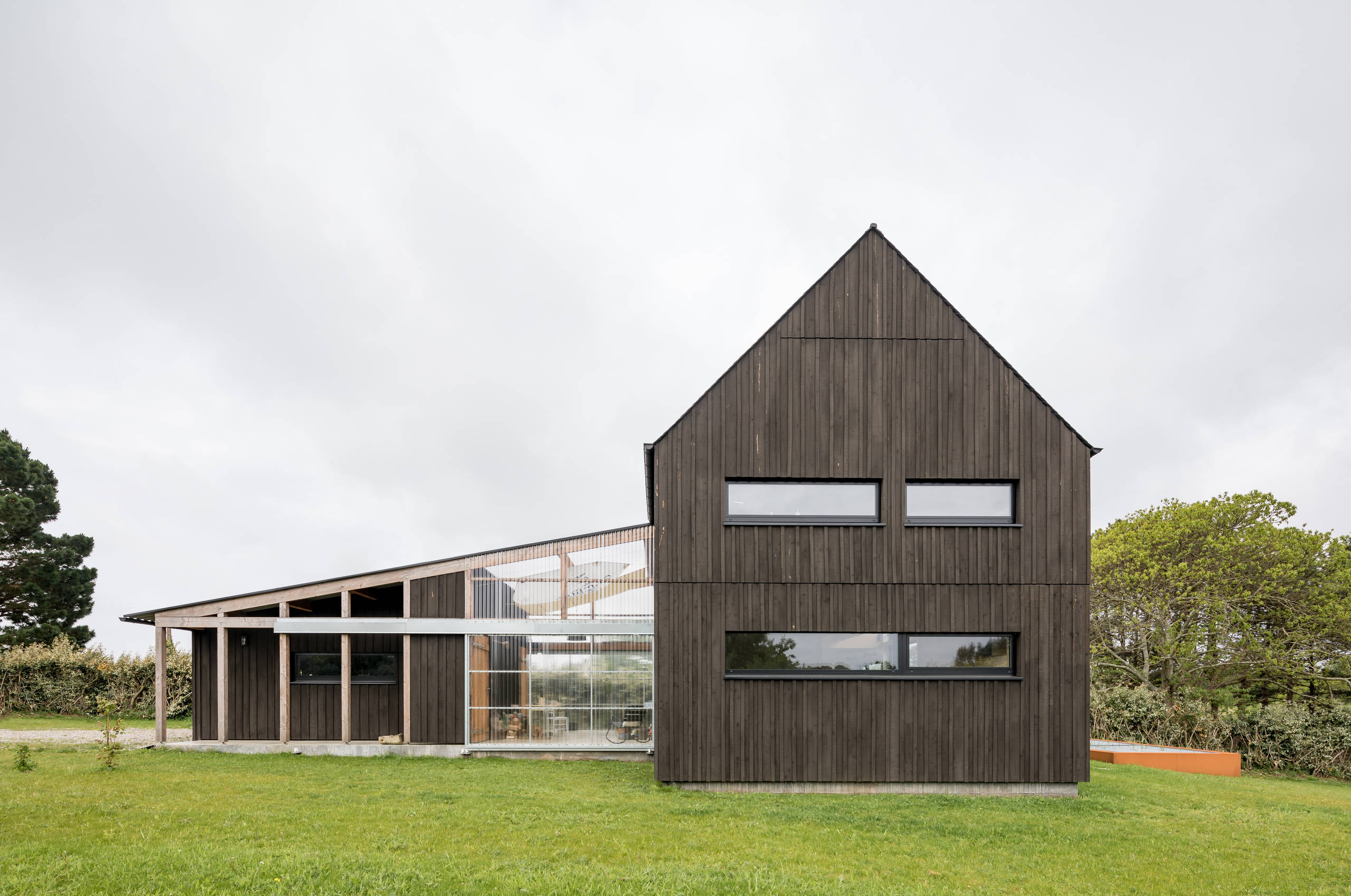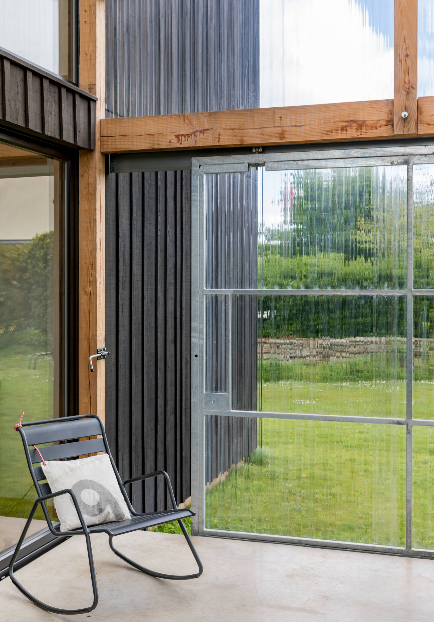 À gauche, dans le prolongement de la serre, se trouve l’appentis. Sa toiture a été réalisée en fibrociment ondulé noir. Les ondes de la serre et de l’abri s’imbriquent parfaitement les unes dans les autres pour former un ensemble homogène et cohérent.