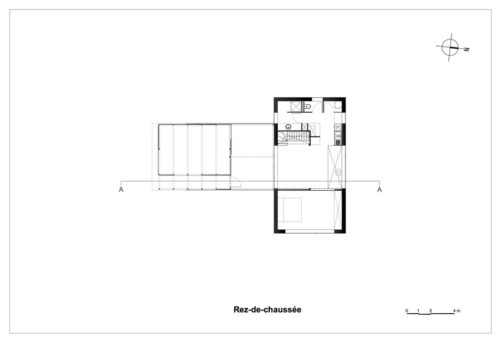 Le rez-de-chaussée accueille la cuisine ouverte, la salle à manger ainsi que la chambre parentale. Dans cet espace épuré, la fenêtre en bandeau s’ouvre à l’est pour bénéficier de la lumière matinale.