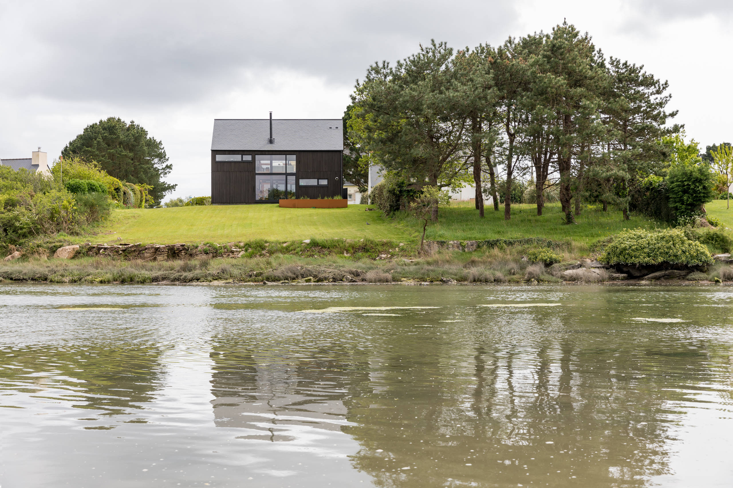 Le couple, qui vivait auparavant dans un appartement sur le port de Douarnenez, a trouvé ce terrain boisé à Lesconil, au bord d’un ster. « Les propriétaires ne se retrouvaient pas dans les constructions d’architecture contemporaine. Ils recherchaient une bâtisse correspondant à leur sensibilité : une architecture sobre mais de grande qualité conceptuelle et constructive », explique Philippe Moré.