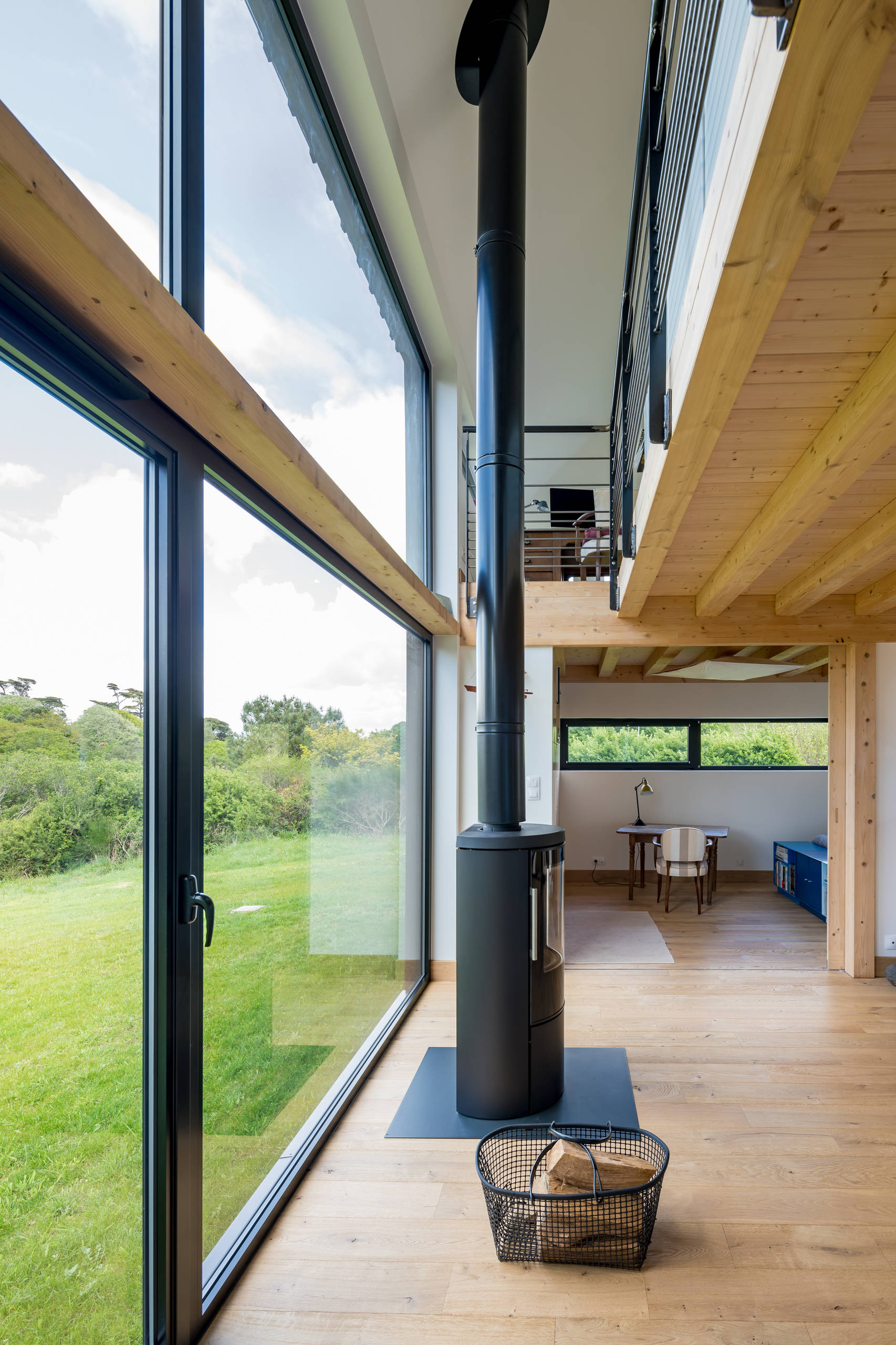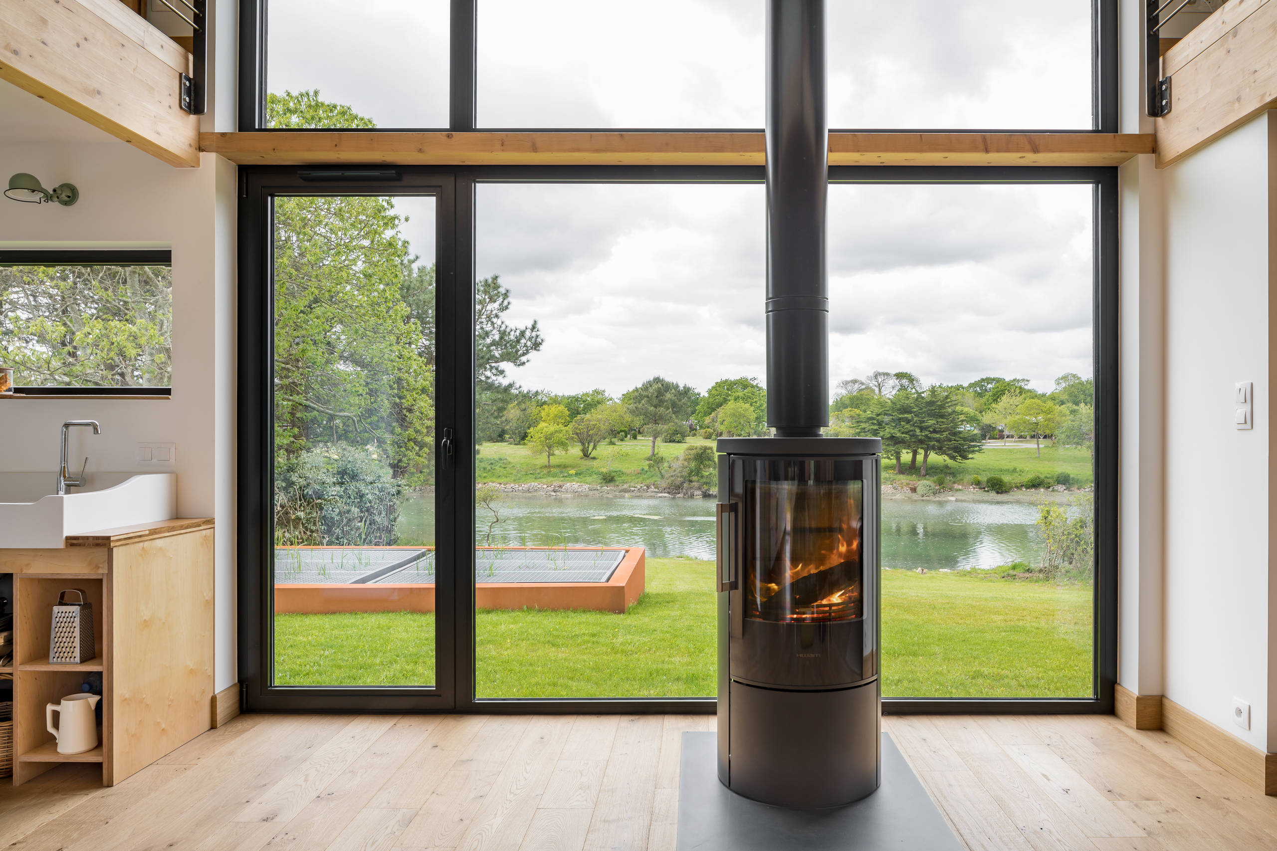 Devant la façade nord, un poêle à bois thermorégulé permet de chauffer l’ensemble de la maison. Une isolation en ouate de cellulose a été au préalable insufflée dans les murs, les rampants de toiture ainsi que le plancher pour maintenir une bonne température.