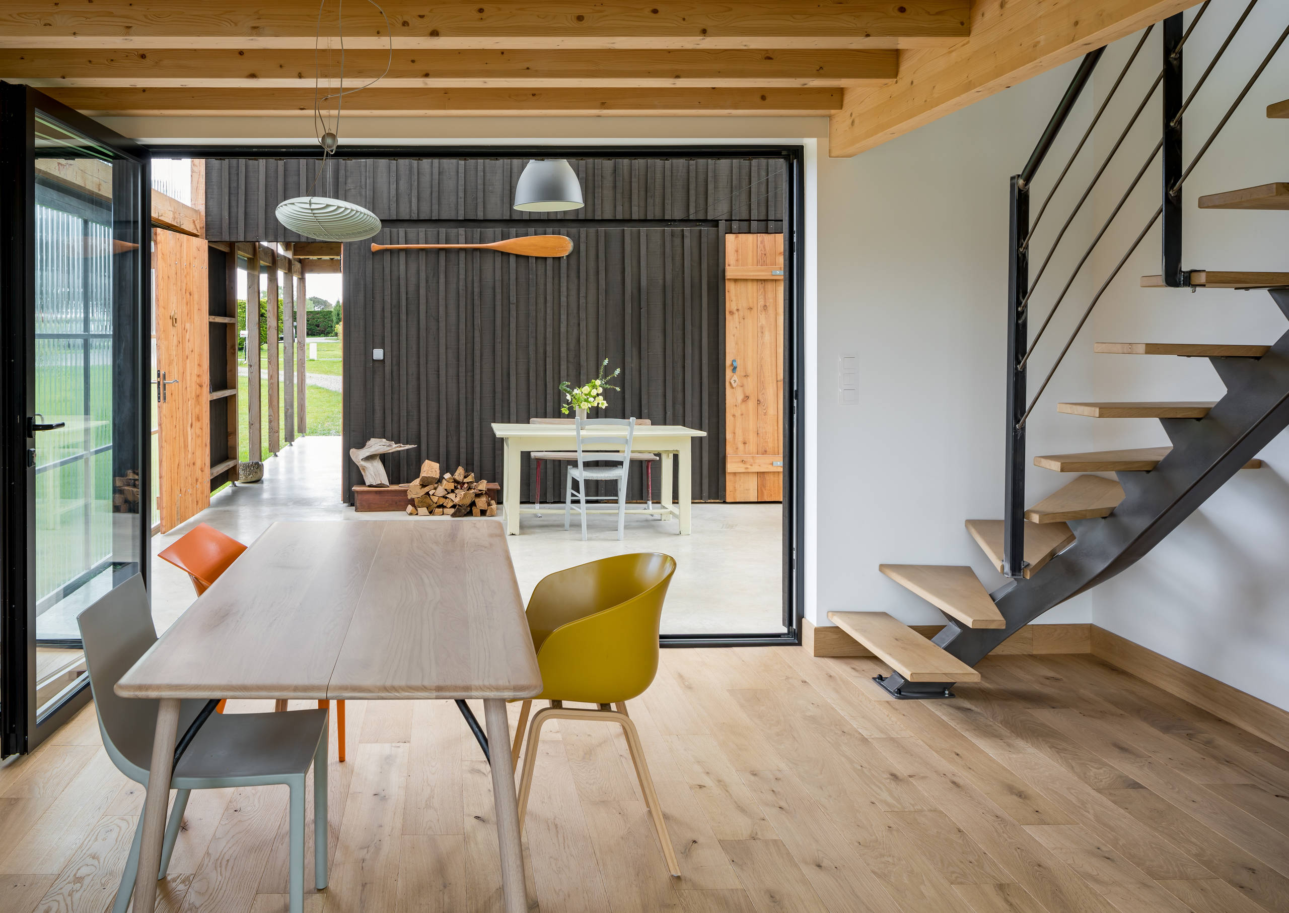 Le chêne se marie à la poutraison en Douglas ainsi qu’aux portes réalisées sur mesure en épicéa. Lorsque la baie vitrée en éventail, qui sépare la serre de la pièce principale, est ouverte, les propriétaires des lieux bénéficient d’un espace de plus de 50 m².