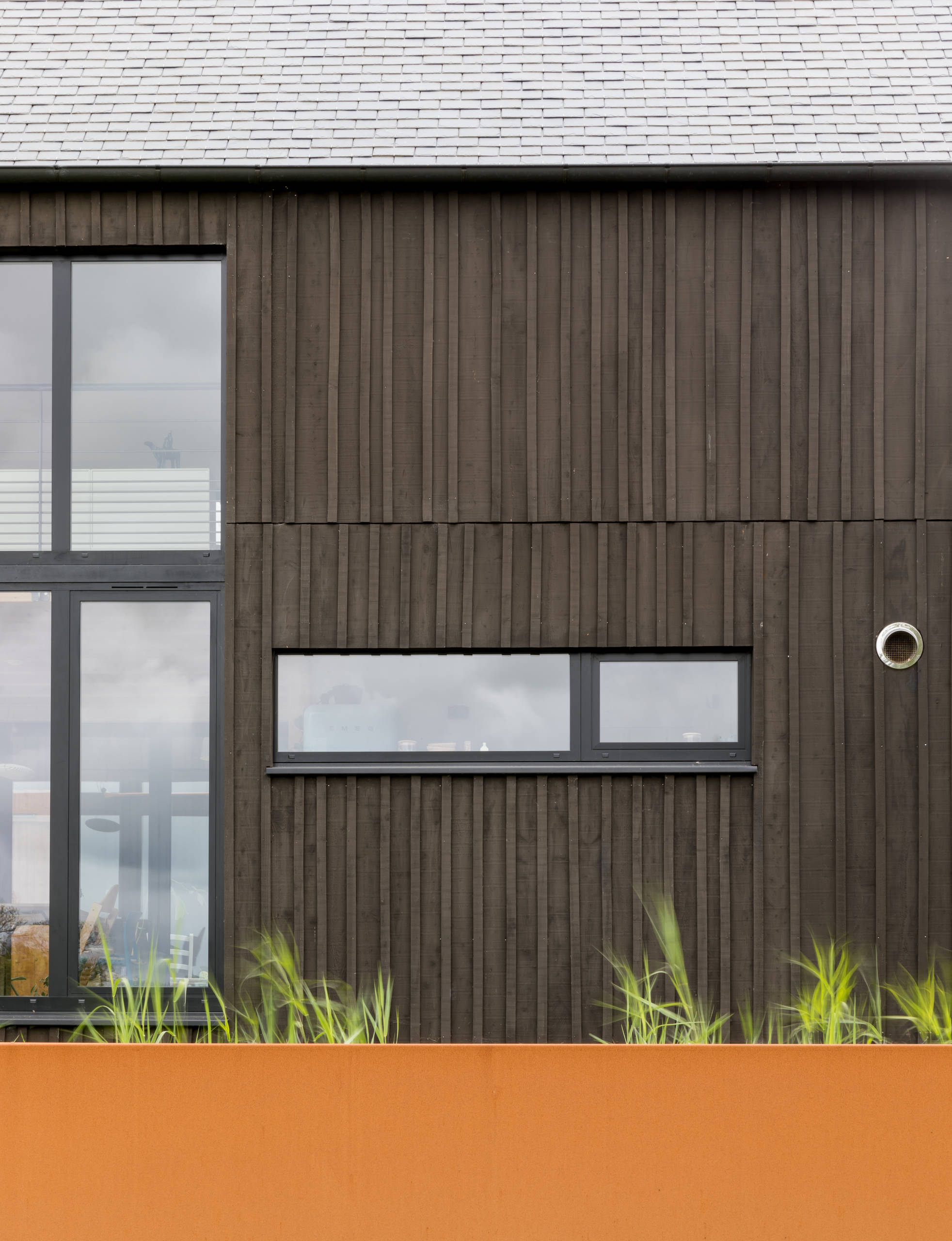 La teinte orangée du bardage en acier Corten créé un contraste saisissant avec la façade sombre de l’édifice.