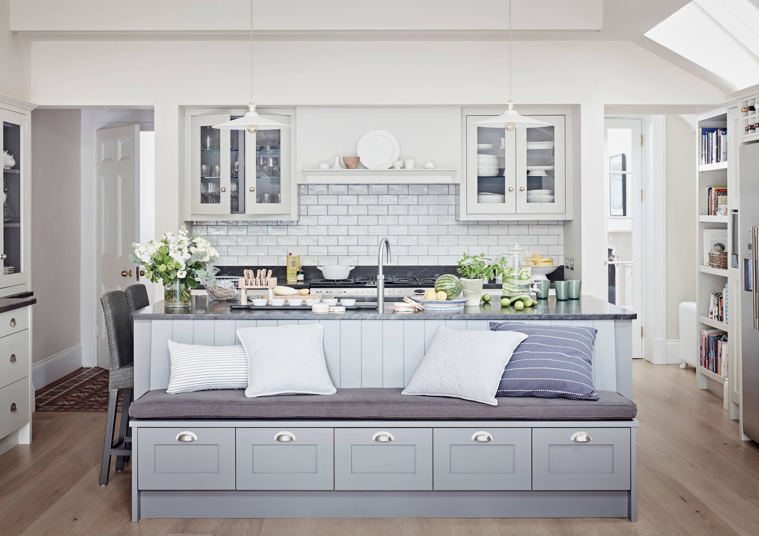 Not everyone likes the idea of perching up on a stool to eat, so why not take inspiration from this clever design, where the back of the island is used to form a bench?