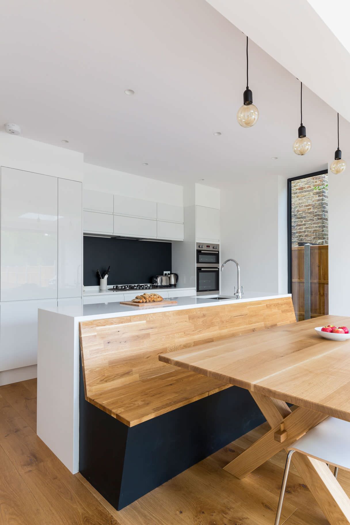 A timber table in front matches the bench, helping to create two distinct zones – the wooden eating area and the sleek white cookspace.