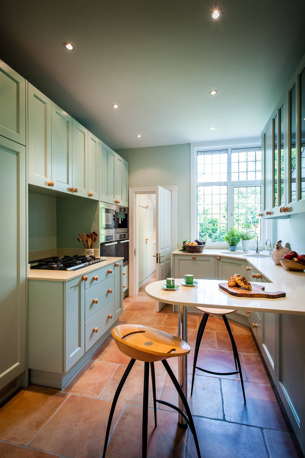 There’s no rule that says kitchen stools have to be plain metal or wood. These super-comfy, high-backed, upholstered stools are nestled around a slightly curved island, making a great sociable area for a drink and a chat.