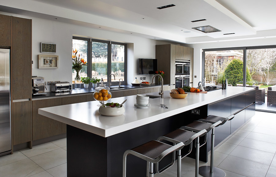 Neat and simple, an extended section of island worktop forms a useful seating area in this sleek kitchen.