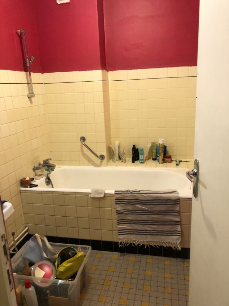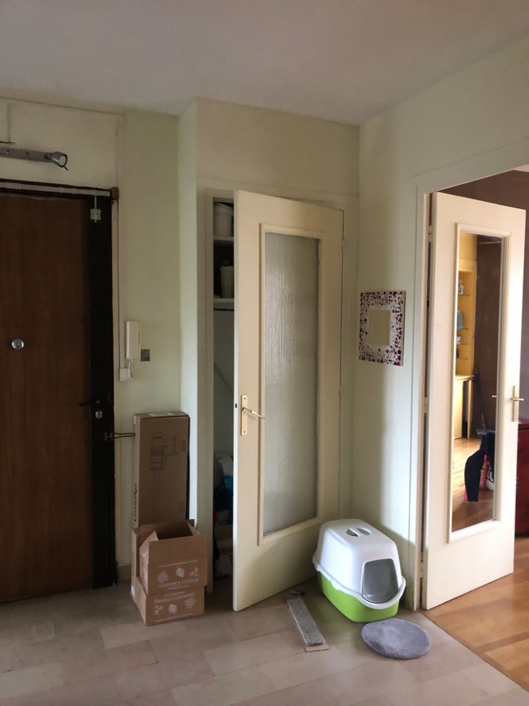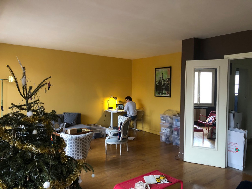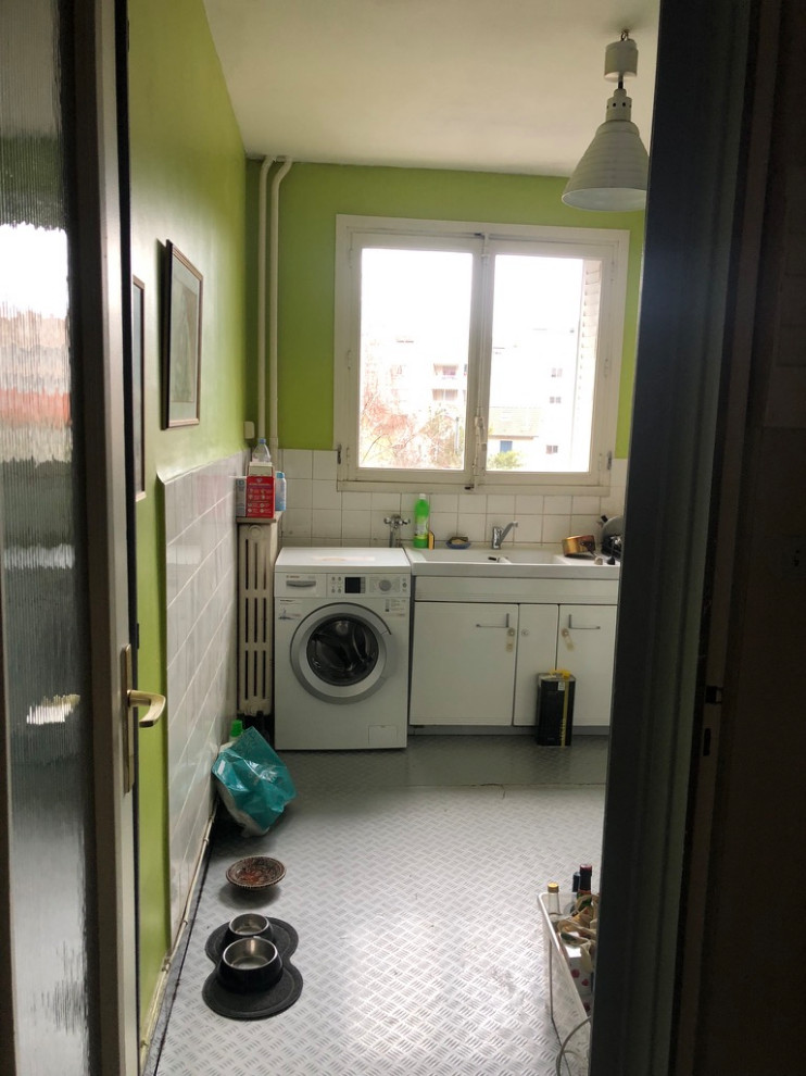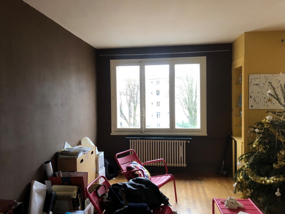 Avant. Sur le plateau de la Croix-Rousse, un quartier prisé du 4ᵉ arrondissement de Lyon, la copropriété des années 1950 accueillait au 2ᵉ étage sur rue cet appartement de deux chambres, quasi inchangé depuis sa construction. Il a plu aux acquéreurs pour sa situation centrale, sa belle superficie et sa vue totalement dégagée depuis la pièce de vie. Mais son état suranné nécessitait une rénovation intégrale.