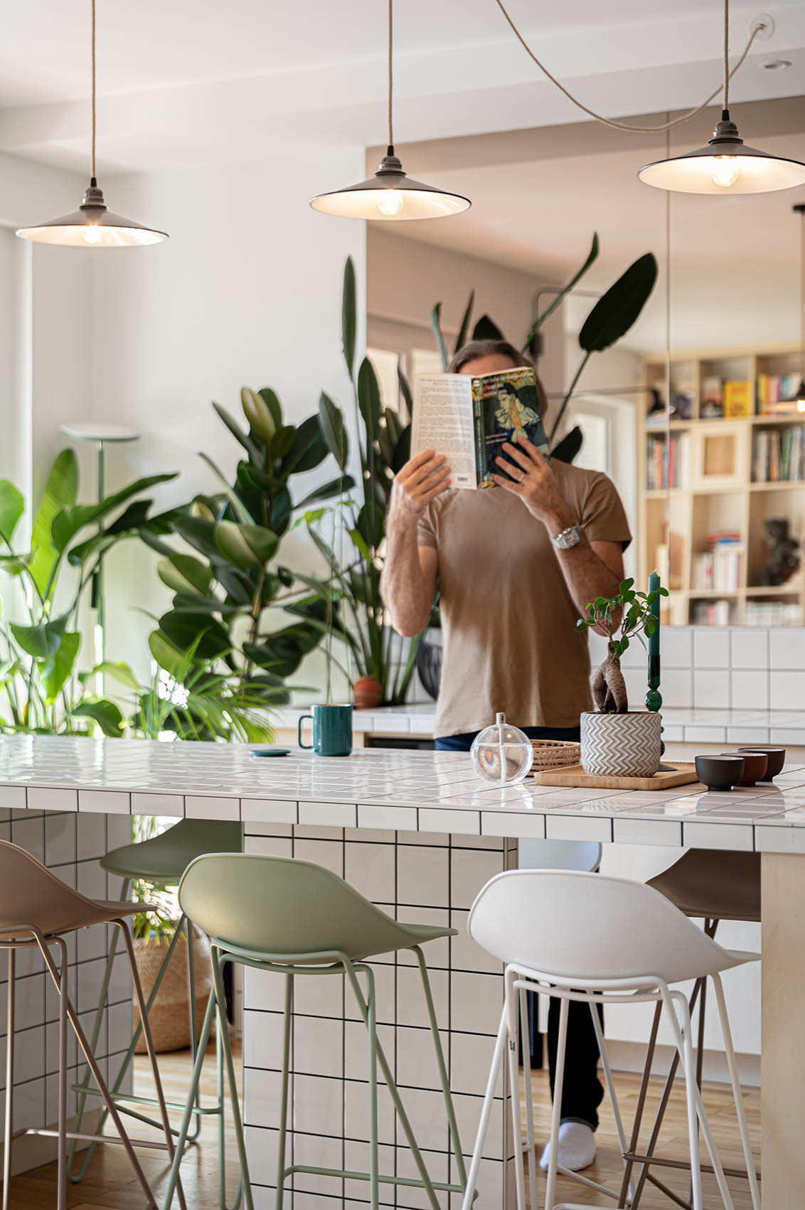 Les propriétaires se sont également impliqués sur le choix de leur canapé, séduits par ses lignes organiques et sa couleur verte qui s’accorde avec leurs plantes. Cette pièce maîtresse illustre parfaitement le fil conducteur de la rénovation : un dialogue constant entre les lignes droites rigoureuses de l’époque moderniste, adoucies par des touches contemporaines plus douces et des touches colorées.