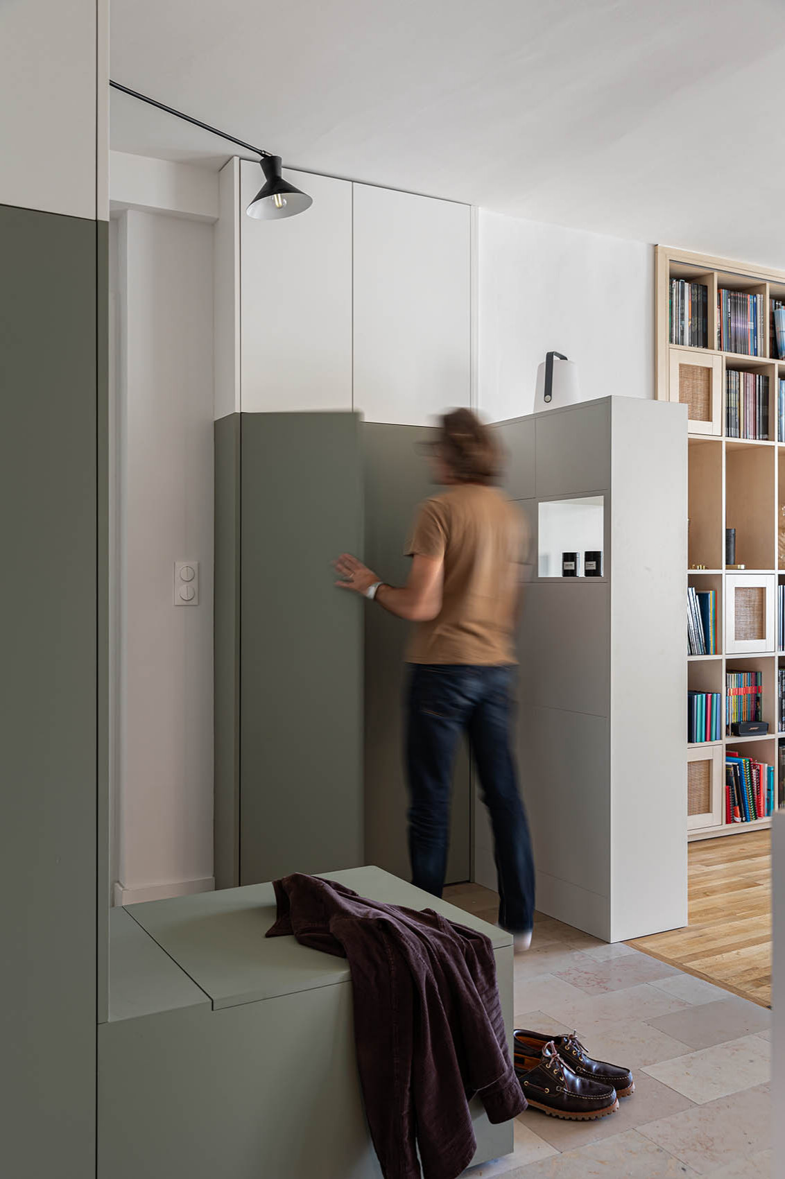 Ainsi, dans l’entrée désormais décloisonnée, une banquette-vestiaire et une bibliothèque-secrétaire créent des filtres vers la pièce de vie, tout en augmentant les différentes fonctionnalités sans attenter à la luminosité. « Aujourd’hui, il n’y a plus de pièces noires dans cet appartement », apprécie le professionnel.