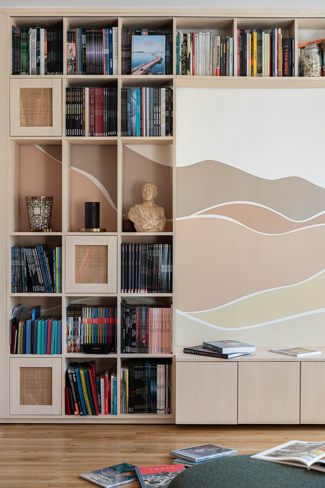 En ce qui concerne la touche décorative finale, l’architecte d’intérieur a laissé la main aux propriétaires pour trouver le fond de scène de leurs rêves. Une fresque murale au motif de dunes sert de toile de fond à la bibliothèque, atténuant naturellement l’impact visuel des ouvrages tout en créant une atmosphère apaisante. « Je laisse toujours mes clients choisir leur décor, même si je les guide. Il me semble toujours primordial qu’ils se sentent alignés avec leur espace de vie, puisque ce sont eux qui vont y vivre », insiste-t-il.