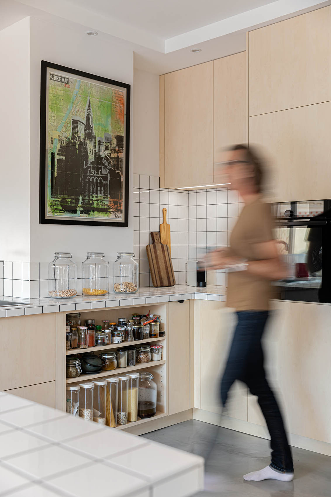 Après. Les attentes de ce couple étaient simples et limpides. « Ils souhaitaient de nombreux rangements pour leurs livres et vêtements et une grande cuisine car ils cuisinent et reçoivent beaucoup », détaille le professionnel qui, par ailleurs, a eu une quasi-carte blanche décorative.