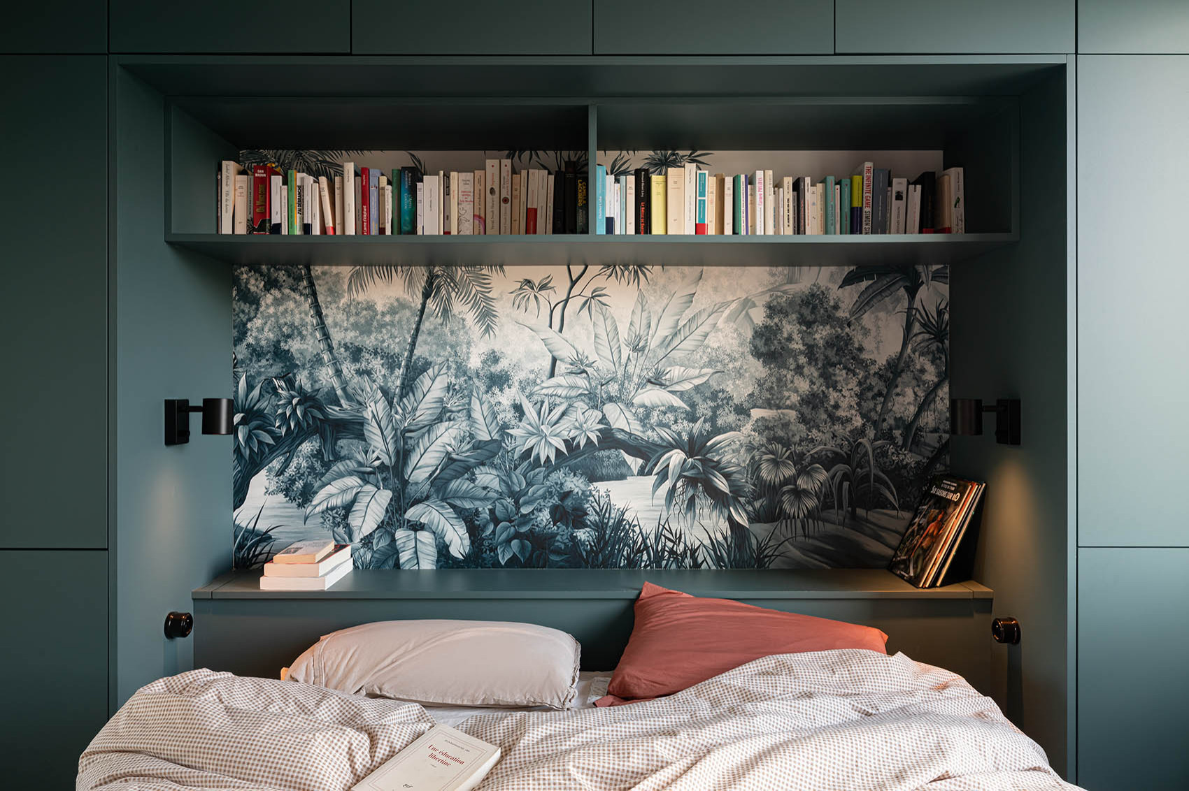 La tête de lit parée d’un panoramique végétal choisi par les propriétaires a été équipée de liseuses et d’une étagère dédiée aux lectures du soir.