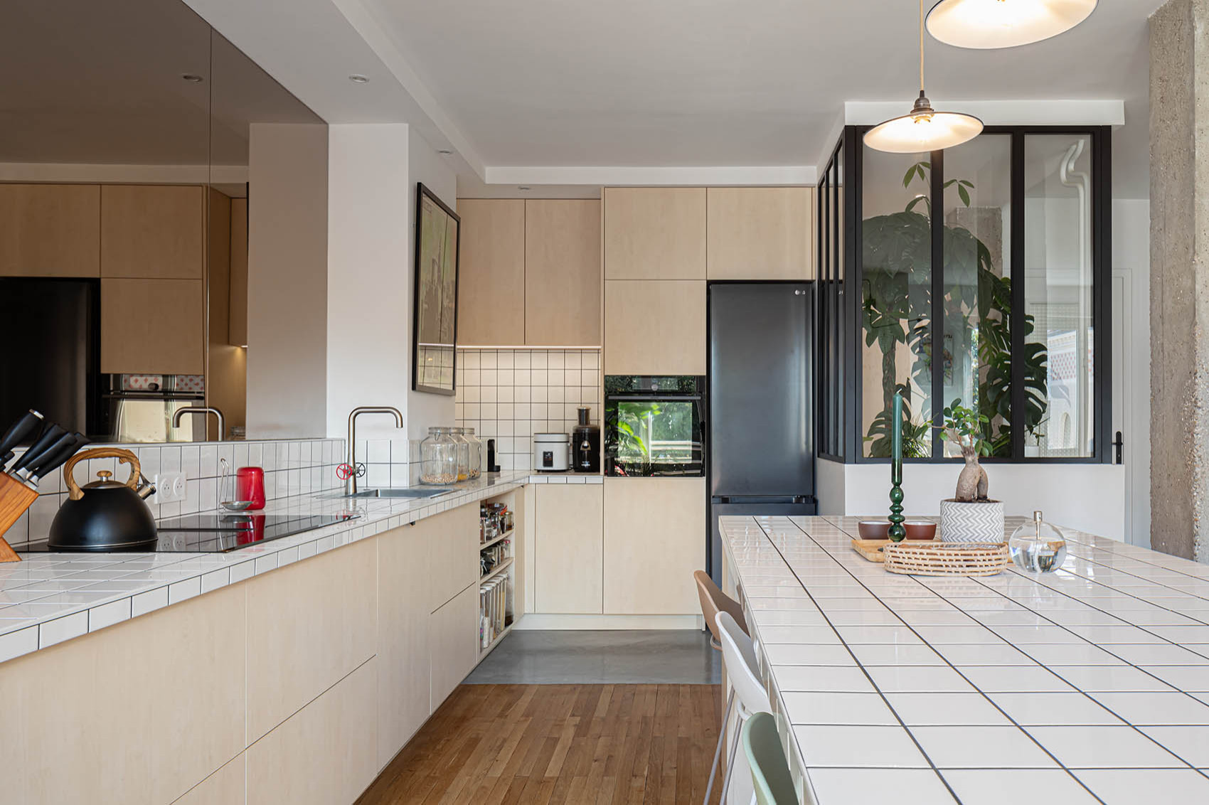 L’îlot et les plans de travail de la cuisine ont entièrement été carrelés en faïence indienne de 10×10 centimètres sur du mobilier réalisé sur mesure avec des portes en contreplaqué de bouleau. « Le menuisier a réalisé la structure de la table en contreplaqué et médium, sur laquelle le carreleur a collé les carreaux de faïence », explique Régis. Si la finition en émail blanc est imbattable au niveau tarif (moins de 10 euros par mètre carré), en revanche, le professionnel n’a pas compté son temps pour réfléchir au calepinage idéal. « L’idée était d’employer un maximum de carreaux pleins. Comme ce sont des carreaux très fins, les coupes sont très difficiles, et impossibles à 45° », précise-t-il.