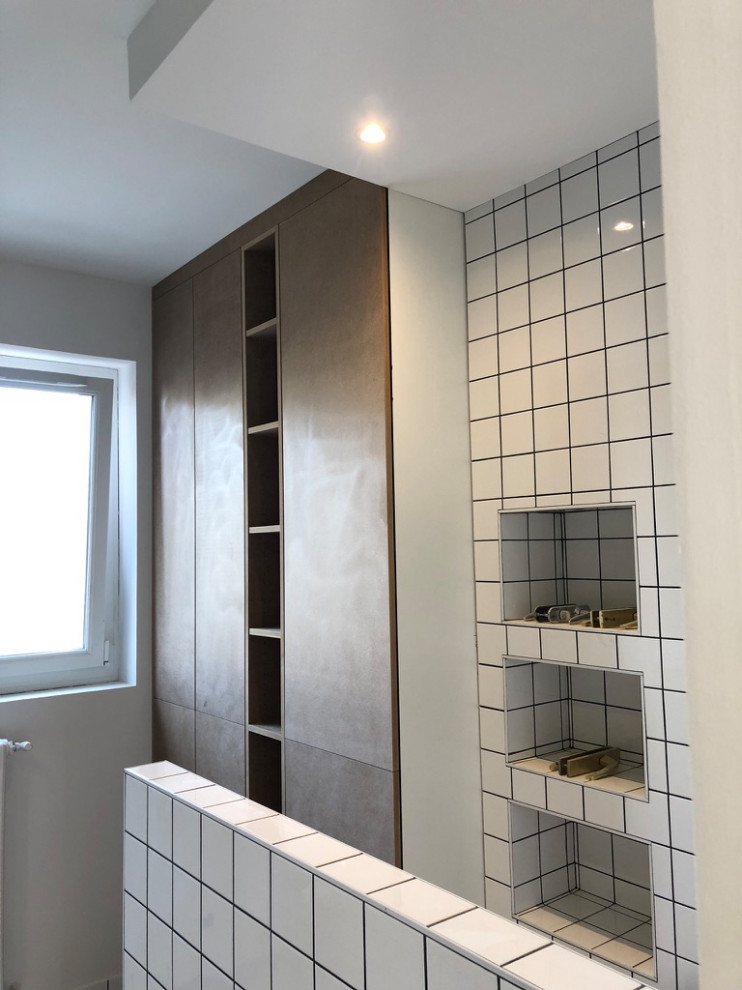 Cette salle de bains entièrement repensée a gagné une fenêtre. Une spacieuse douche avec niches de rangement remplace avantageusement l’ancienne baignoire tandis qu’un meuble sur mesure intègre à la fois des rangements et une colonne technique pour le lave-linge et le sèche-linge. Les toilettes sont pour leur part restées au même endroit, leur porte donnant désormais dans cette la salle de bains.