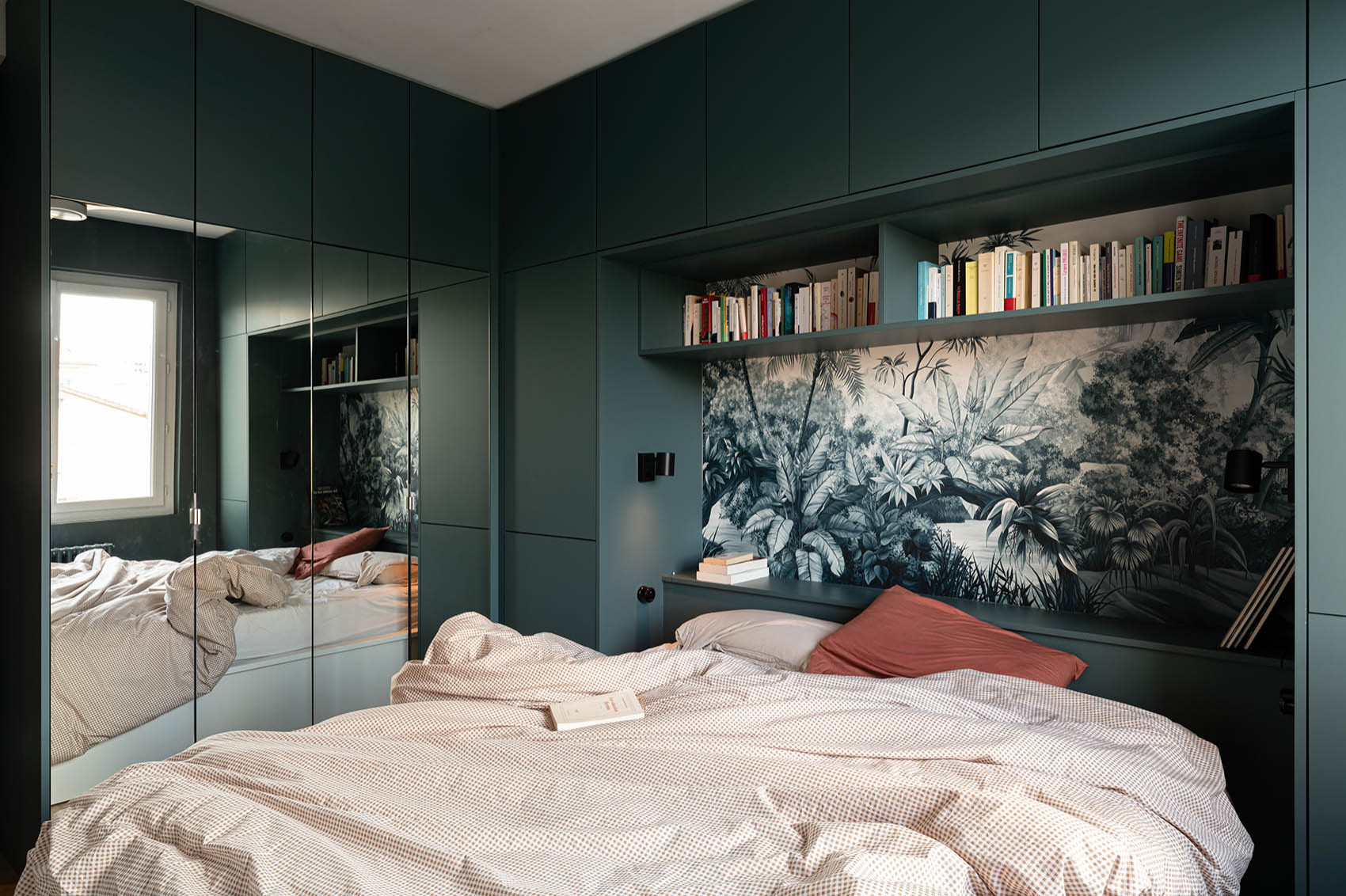 Deux des côtés de la chambre ont été truffés de rangements sur mesure toute hauteur, peints en un vert soutenu qui donne à cette chambre des airs d’un cocon des plus intimes. « Le lit-coffre sert à ranger les valises et autres choses volumineuses et nous avons même créé un coffre en tête de lit pour ranger la couette ou les couvertures en été », explique Régis Lannoy.
