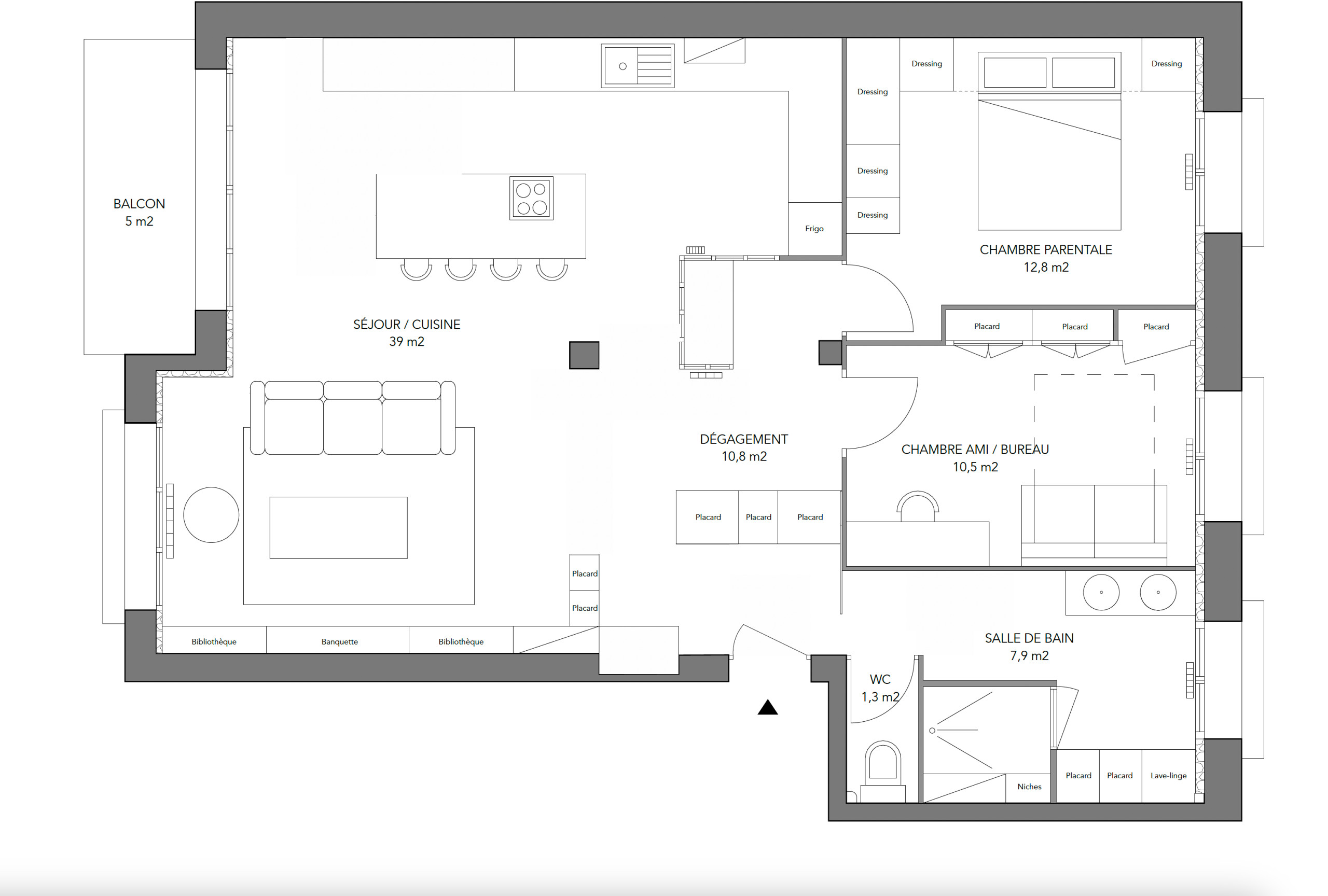 Après. Comme le couple n’appréciait pas du tout la petite cuisine d’origine, reléguée près des toilettes, l’architecte d’intérieur a réorganisé la pièce de vie afin d’inclure la grande cuisine fortement plébiscitée. « Nous avons annexé la salle de bains aveugle pour élargir la pièce de vie. La salle de bains a été transférée dans l’ancienne cuisine afin de respecter les contraintes d’évacuation », explique-t-il.