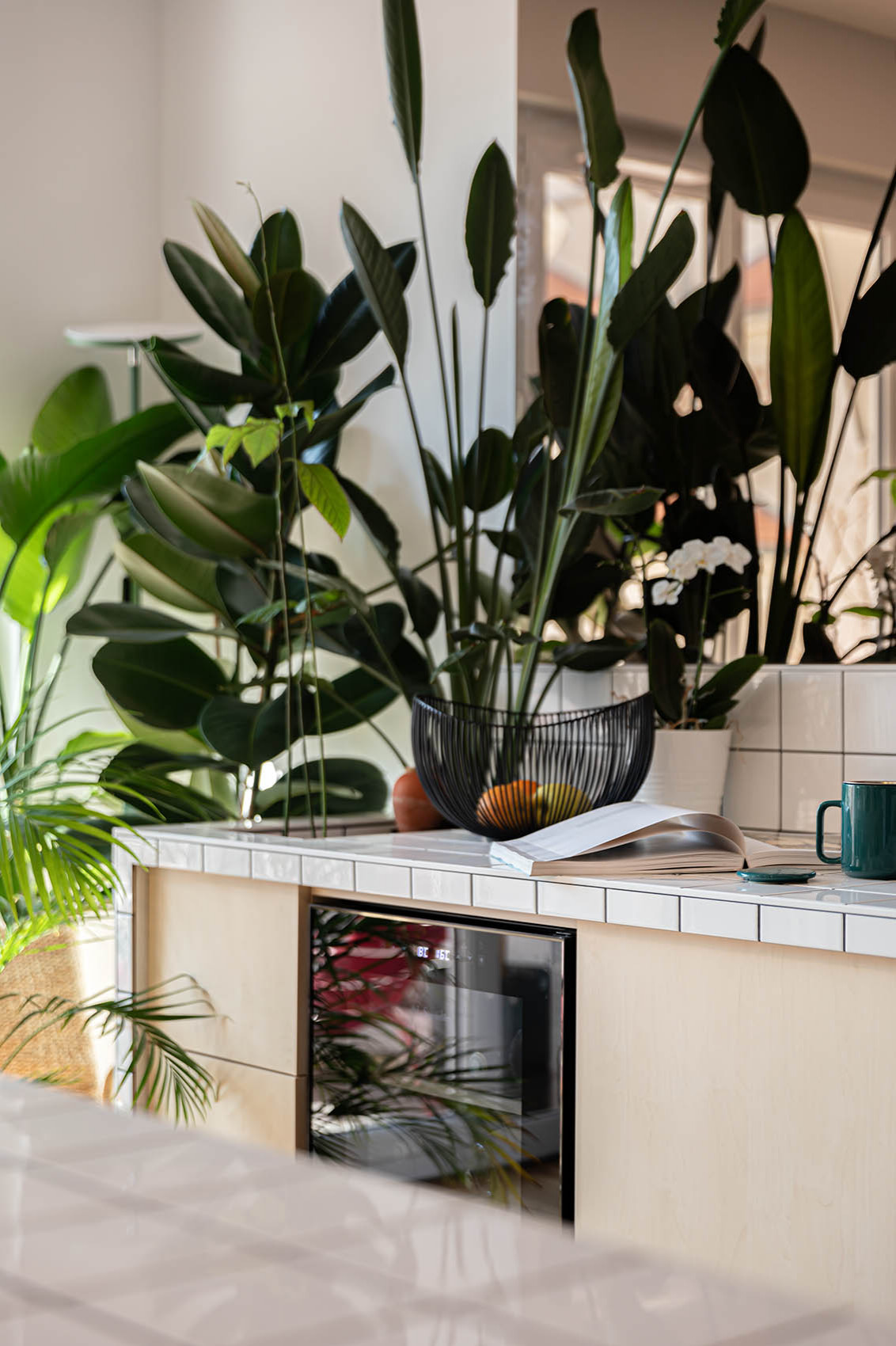Autre bonne idée, la création d’une jardinière intégrée sur la gauche du linéaire où s’épanouit aujourd’hui un splendide strelitzia. Mais la meilleure idée de toutes est sans doute le bac en Inox intégré à même l’îlot : « c’est pour tenir la bouteille de rosé au frais façon seau à glace », s’amuse Régis.