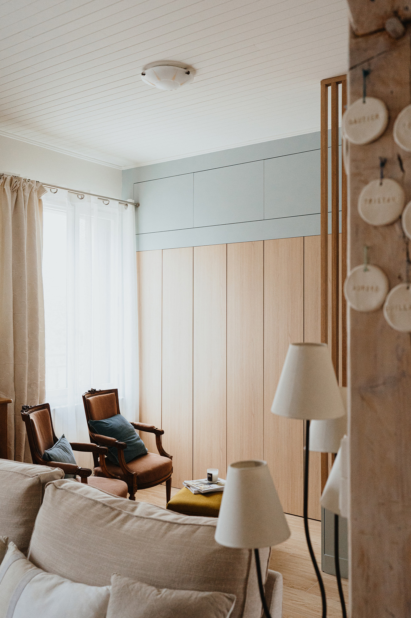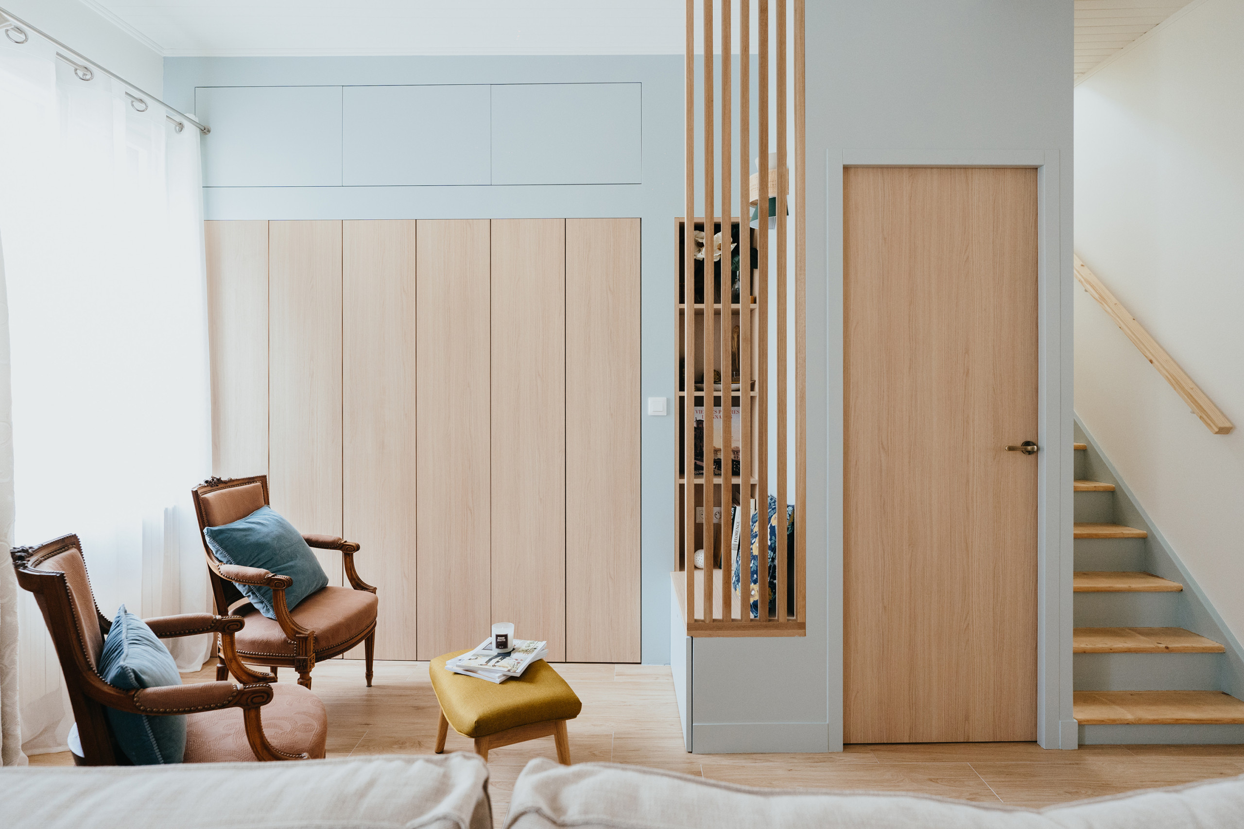 Après. La première phase des travaux a concerné la zone des toilettes et de la salle de bains en lien avec le séjour et l’escalier. Le nouveau fond de scène de la pièce de vie été pensé d’un seul geste depuis les nouveaux rangements jusqu’à l’escalier pour aboutir à un ensemble bien intégré. « Nous avons choisi un duo de chêne et une peinture bleue très douce pour contraster (Tollens Résonance T2028-3). Les placards ont des fermetures push lash évitant les poignées apparentes et la portes du sas a été traitée en continuité avec le même placage chêne », explique l’architecte d’intérieur.