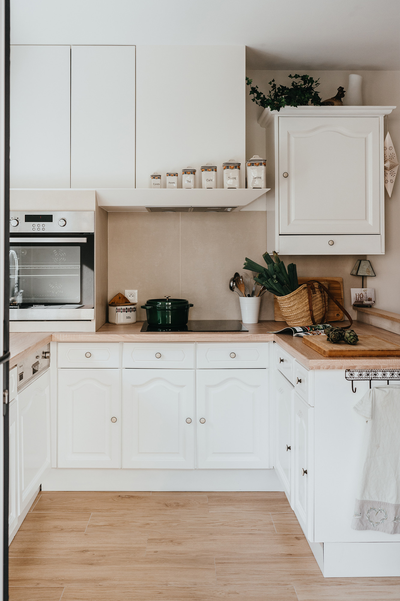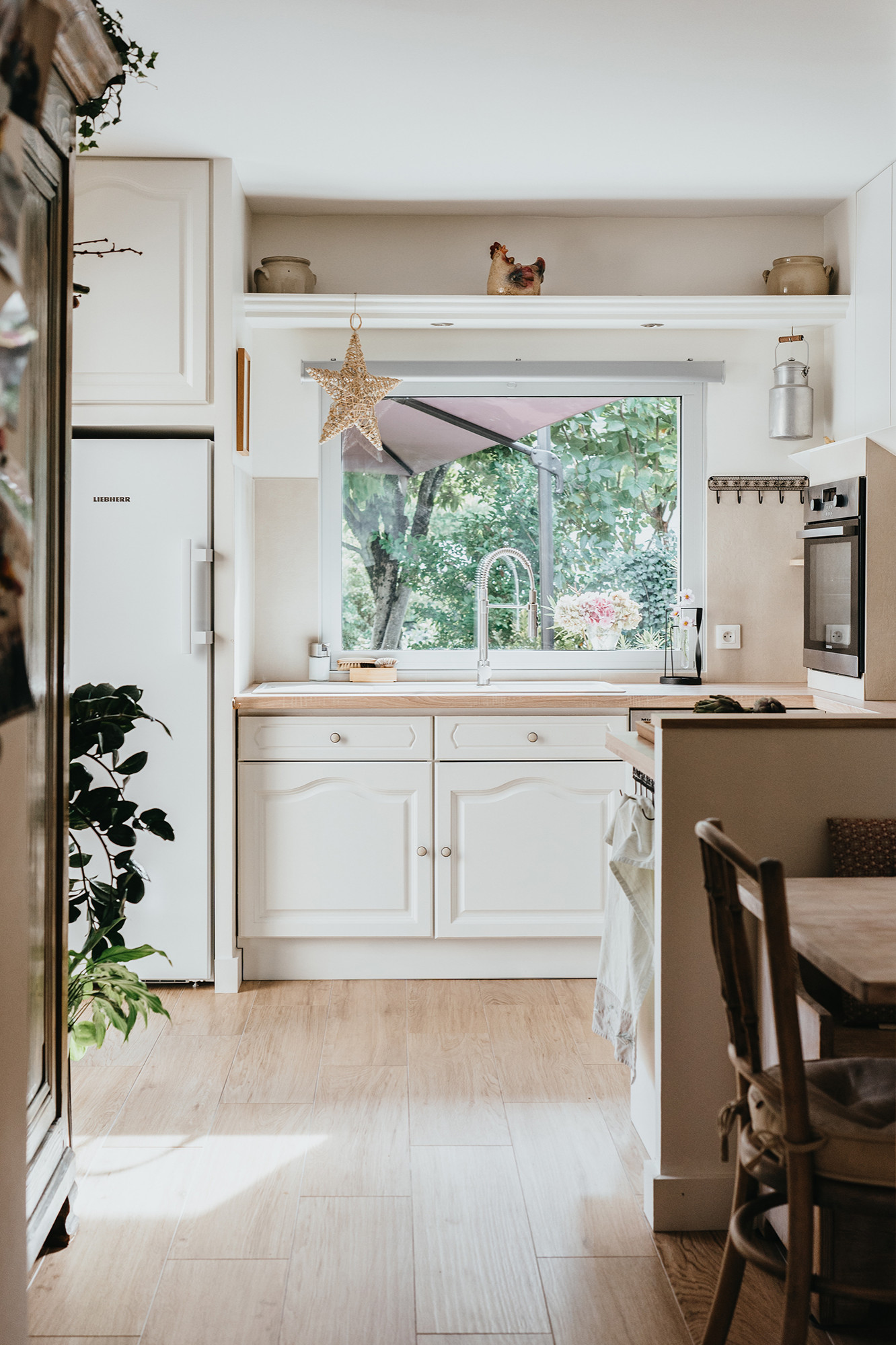 L’évier en faïence marron a également été remplacé par un évier plus moderne en pierre synthétique blanc cassé. Par ailleurs, tous les plans de travail ont été renouvelés avec un stratifié chêne qui s’accorde aux matériaux choisis dans le séjour et apporte un côté chaleureux à la pièce.