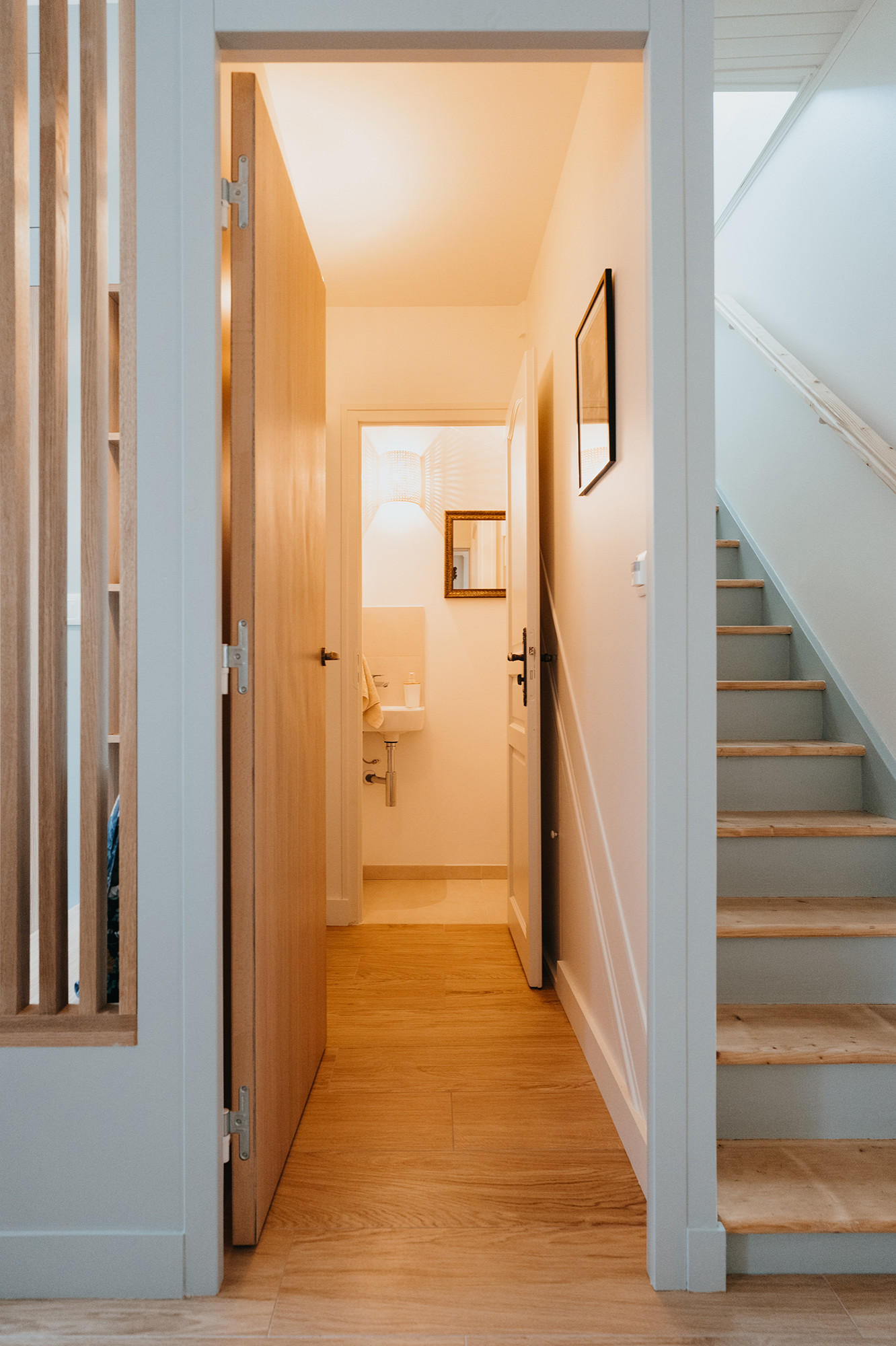 Les toilettes, toujours positionnées sous l’escalier, ont bénéficié d’une rénovation complète : un revêtement en grès cérame beige imitation pierre au sol et l’installation d’une cuvette suspendue modernisent l’espace. Le sas de distribution, qui dessert désormais à la fois les toilettes et la salle de bains depuis le séjour, a tout changé. « C’est une solution particulièrement appréciable en termes d’intimité pour ces propriétaires qui reçoivent régulièrement leur famille », résume Gaelle.