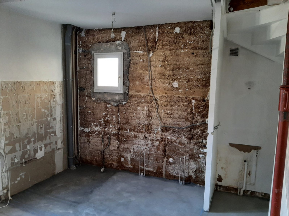 La salle de bains a donc été déposée ainsi que sa cloison donnant sur le séjour afin de commencer les travaux du sas et des rangements, et c’est à ce moment que les choses se sont compliquées. « Le carrelage rose a commencé à tomber tout seul », se remémore Gaelle. « L’entreprise a gratté, trouvé du moisi, regratté et voilà ce qui est apparu : un mur en terre tout fissuré ! »…