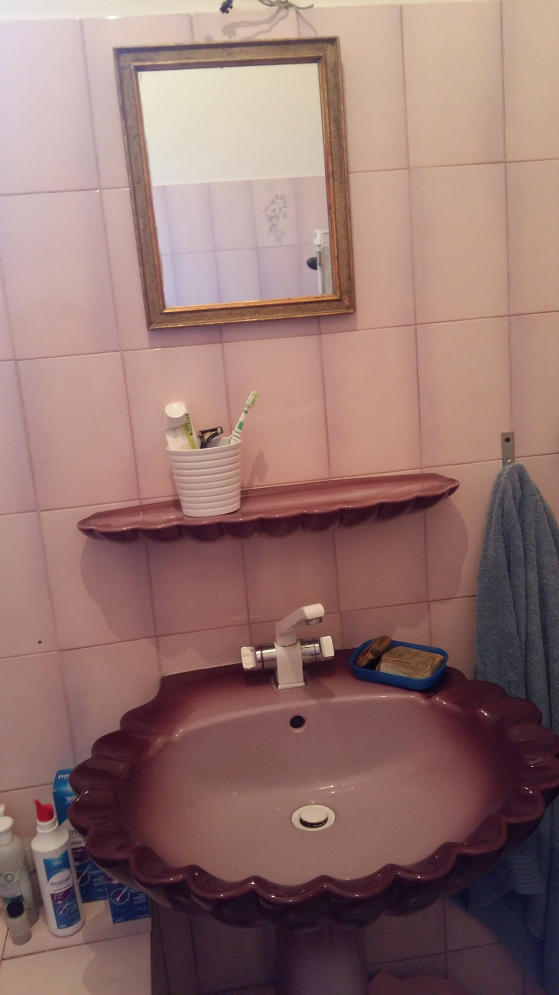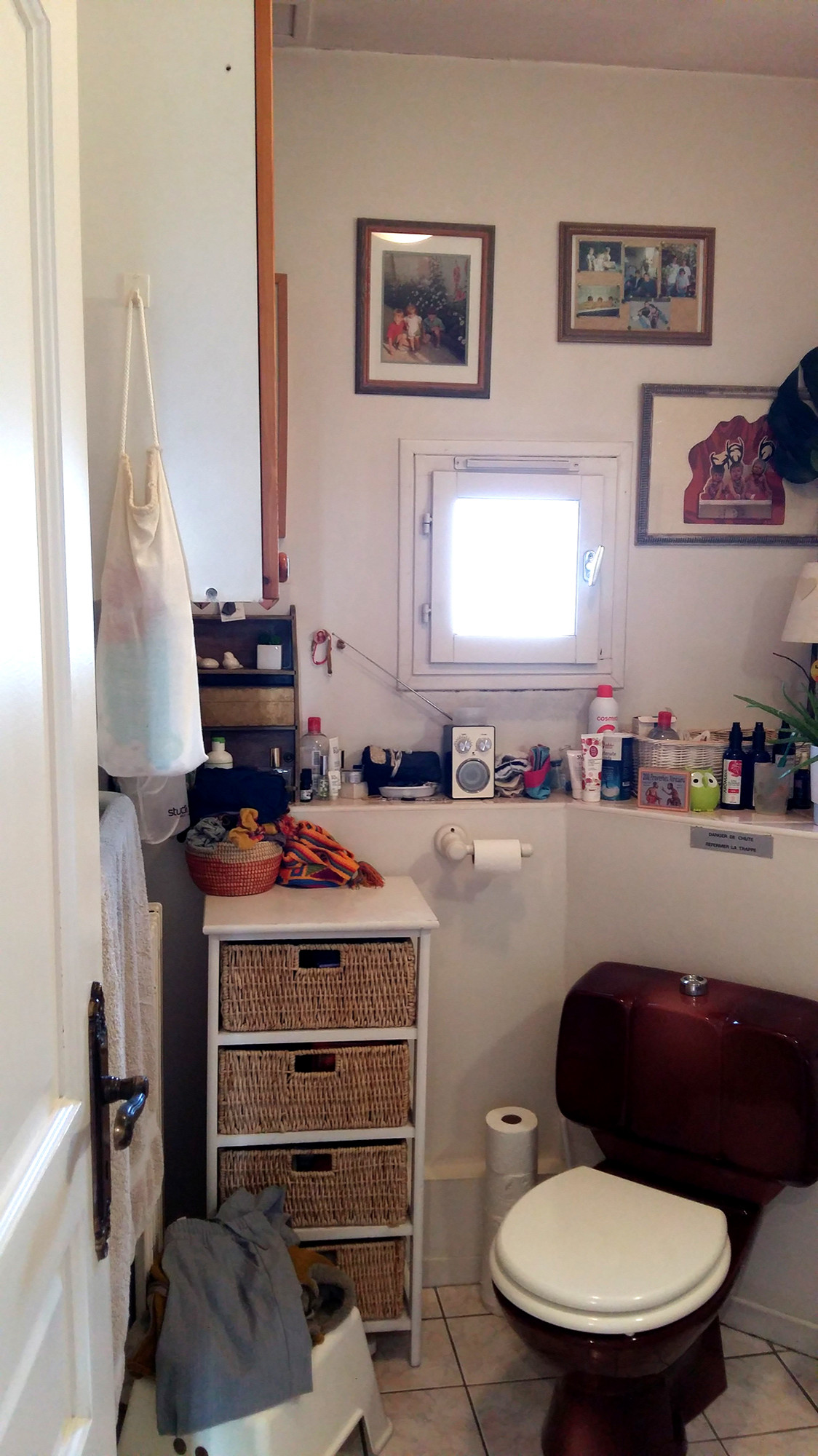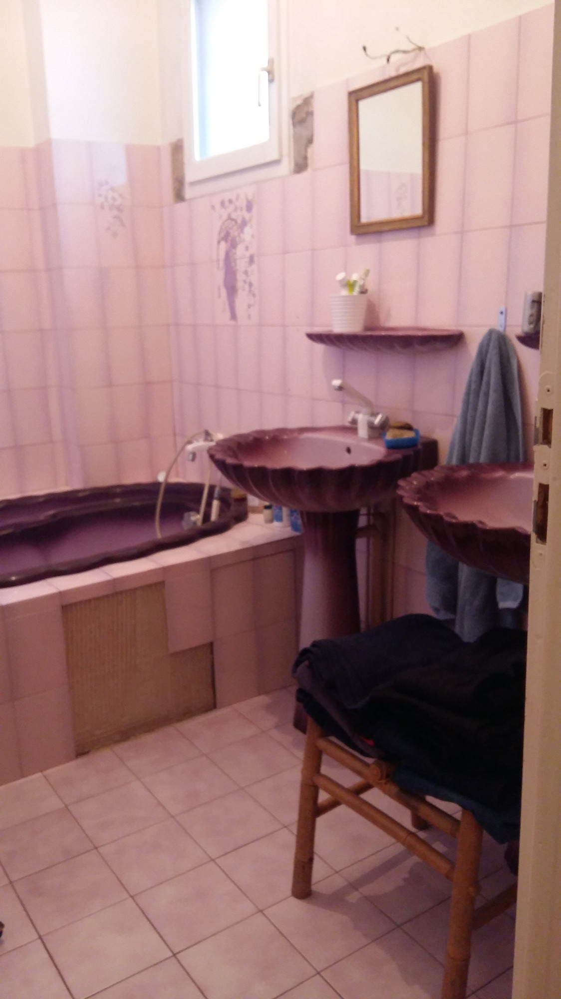 Avant. Voici la salle de bains du rez-de-chaussée avant travaux. Modifier la cloison de la salle de bains n’a pas bloqué les propriétaires, qui ont très vite émis des doléances à propos de cette pièce. « C’était la salle de bains de monsieur, car madame préférait celle du haut, et il ne l’aimait pas. Ils l’avaient récupérée ainsi, avec ses sanitaires bordeaux en forme de fleur et ses carreaux rose. Monsieur ne se servait jamais de la baignoire, c’était pour lui une vraie perte de place », explique Gaelle.