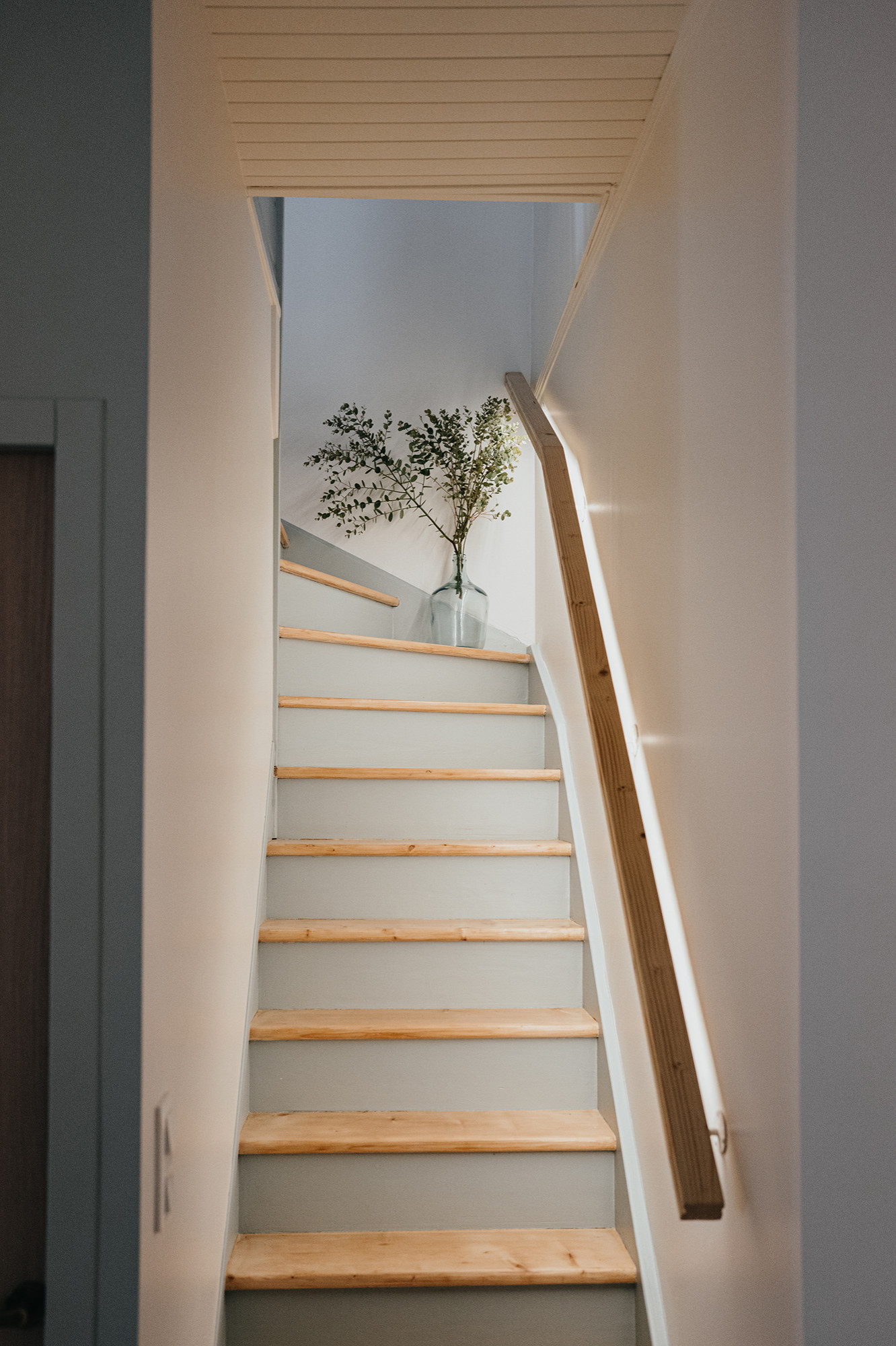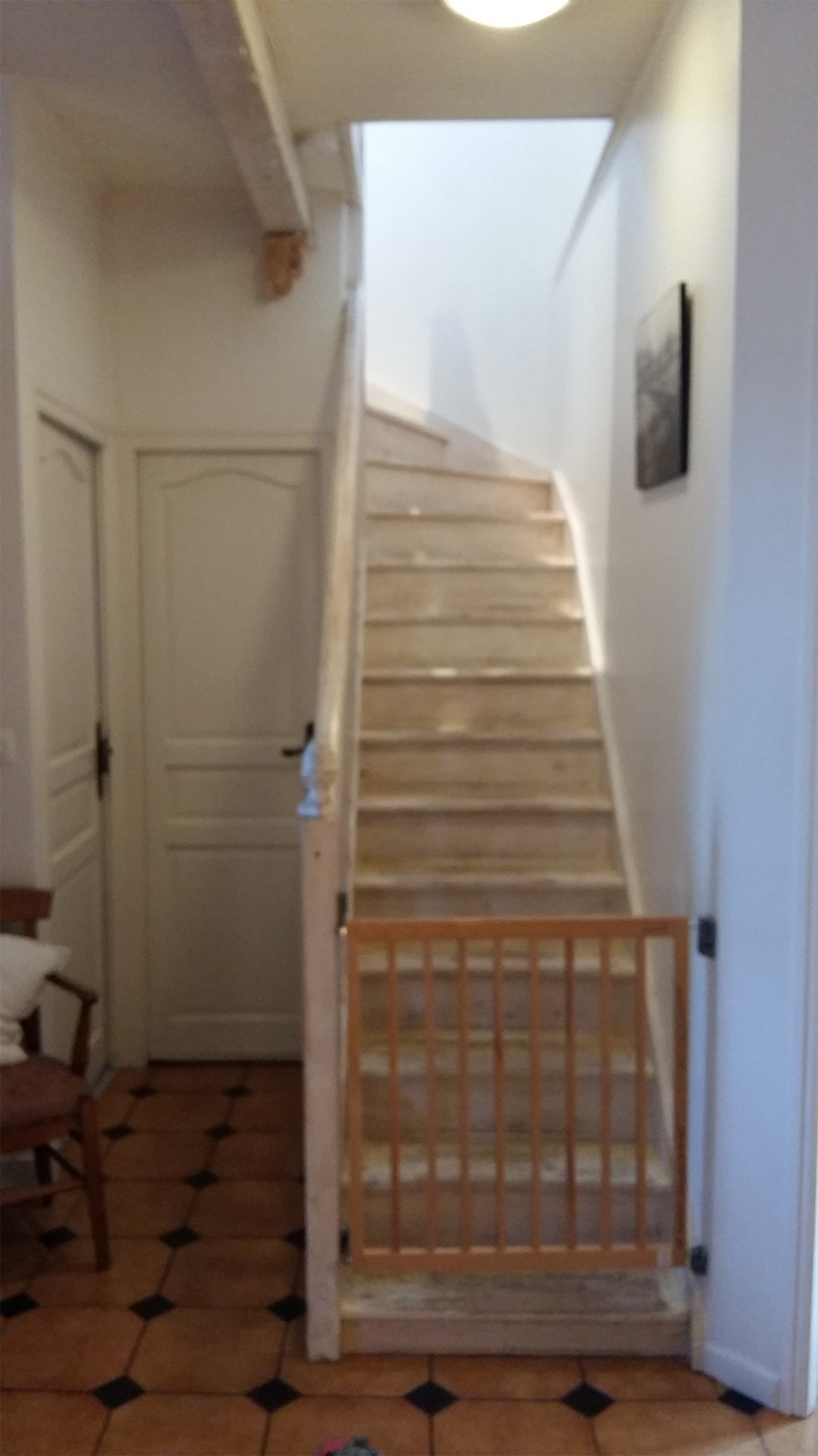 Avant. L’escalier en pin, initialement blanchi par les propriétaires, assure la liaison avec l’étage. Sa vue directe depuis le séjour a imposé sa rénovation en cohérence avec les travaux du séjour.