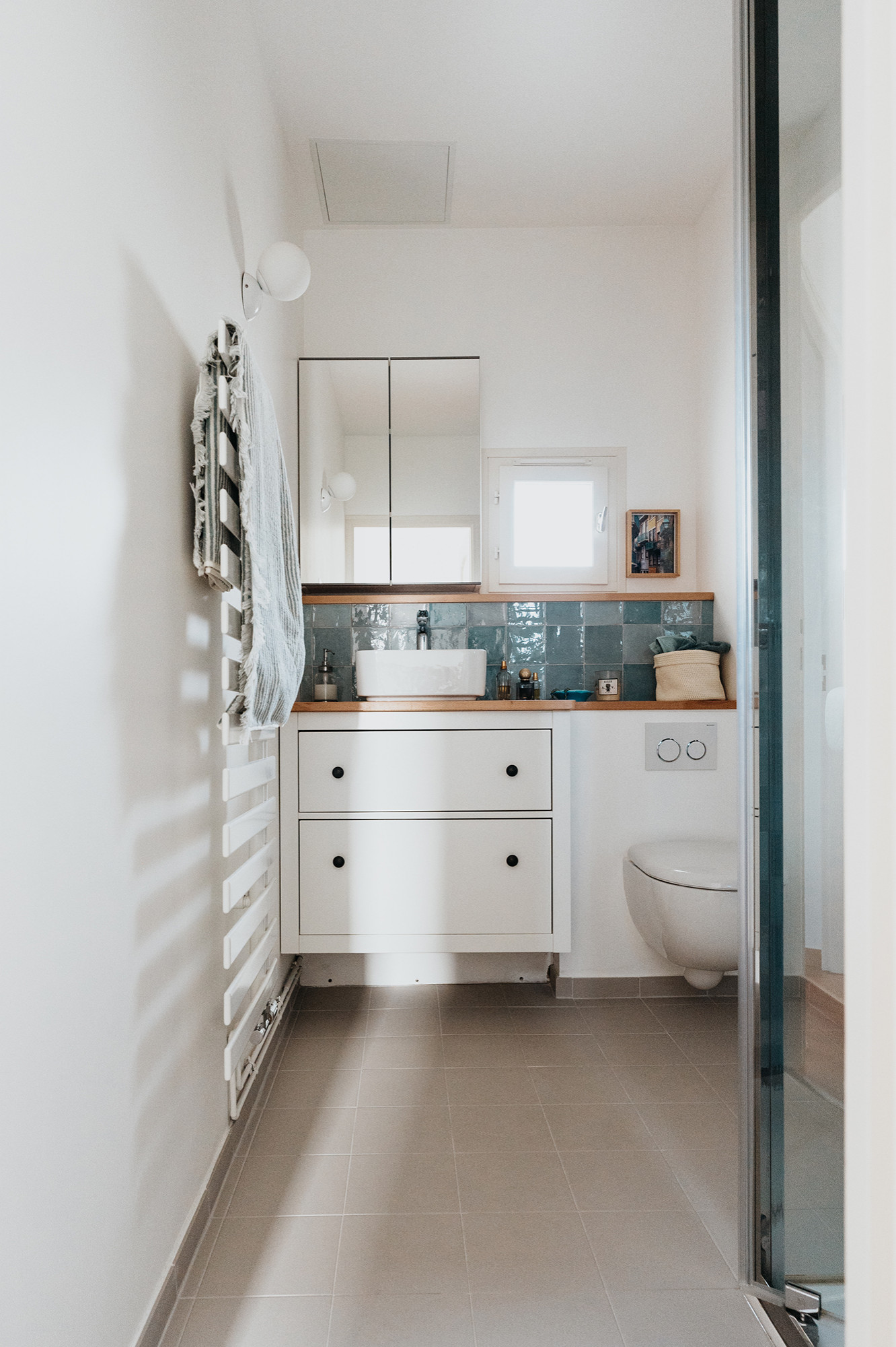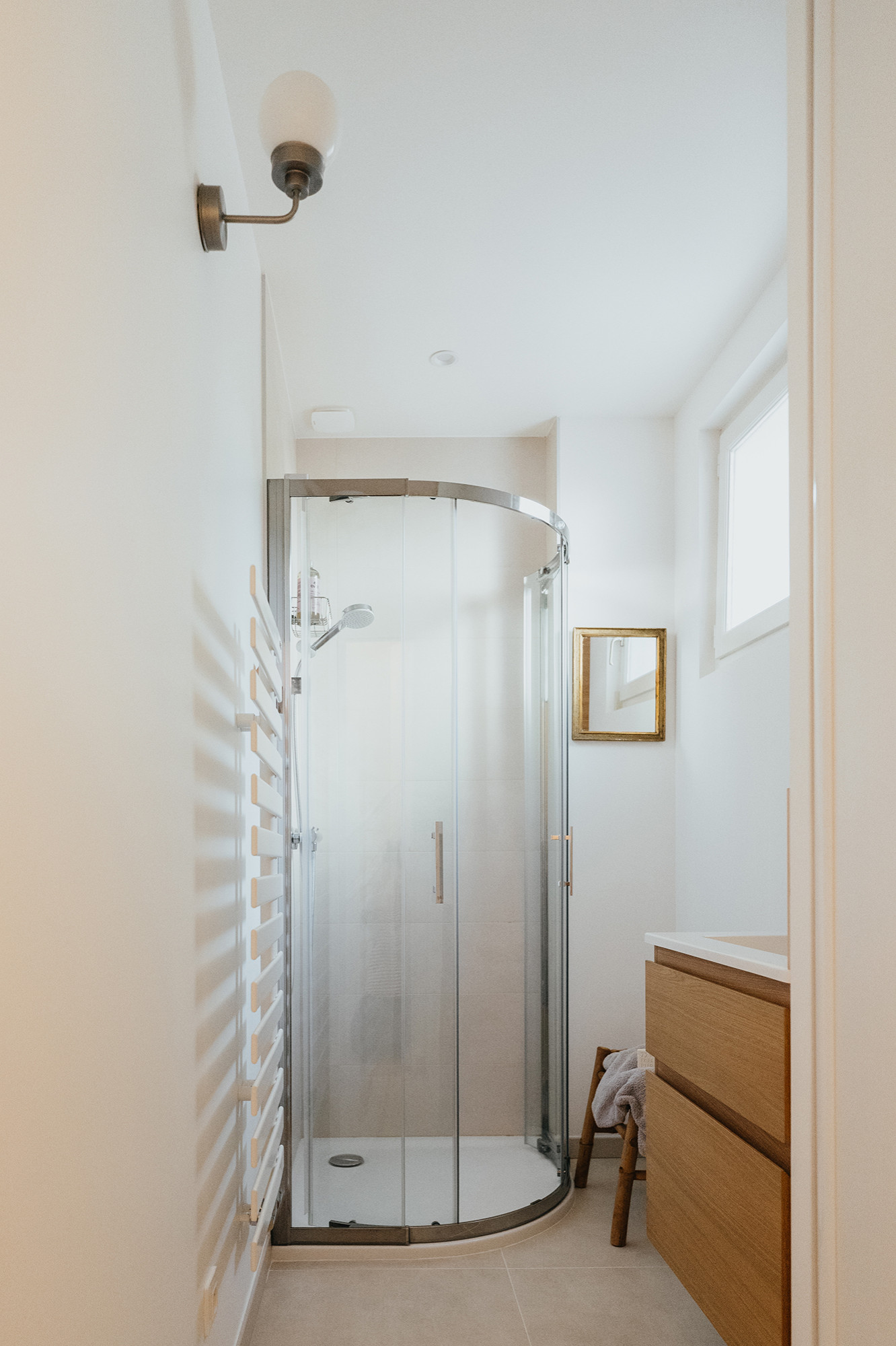 Face au budget imprévu déjà important, l’architecte d’intérieur a cherché des solutions économiques. Son choix s’est porté sur une cabine de douche en applique tout intégrée, une alternative plus abordable qu’une douche à l’italienne qui aurait nécessité une reprise complète de l’étanchéité. « Malgré la réduction de surface, nous avons même gagné en fonctionnalité avec l’installation d’un grand meuble de rangement, alors qu’auparavant, la pièce n’en contenait aucun », souligne Gaëlle