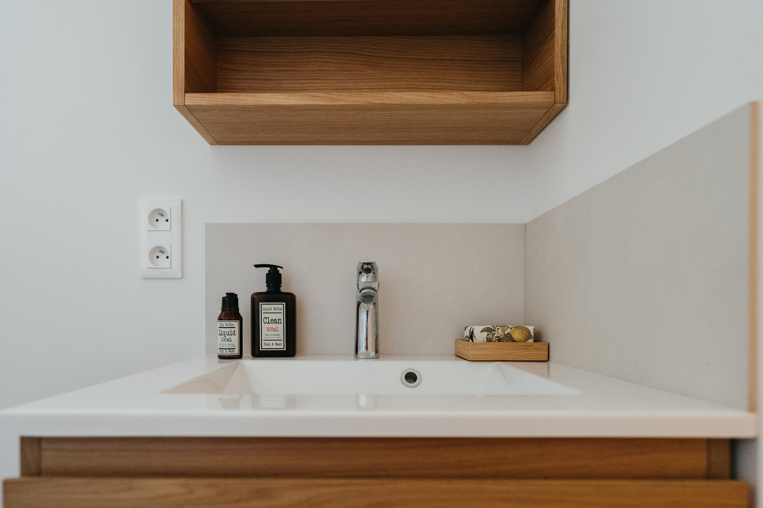 Après. Malgré une surface légèrement réduite, la nouvelle salle de bains s’inscrit parfaitement dans la continuité du séjour. Le mobilier suspendu en placage chêne, qui remplace l’ancienne faïence bordeaux, apporte de l’élégance et davantage de rangements par rapport à l’ancien lavabo.