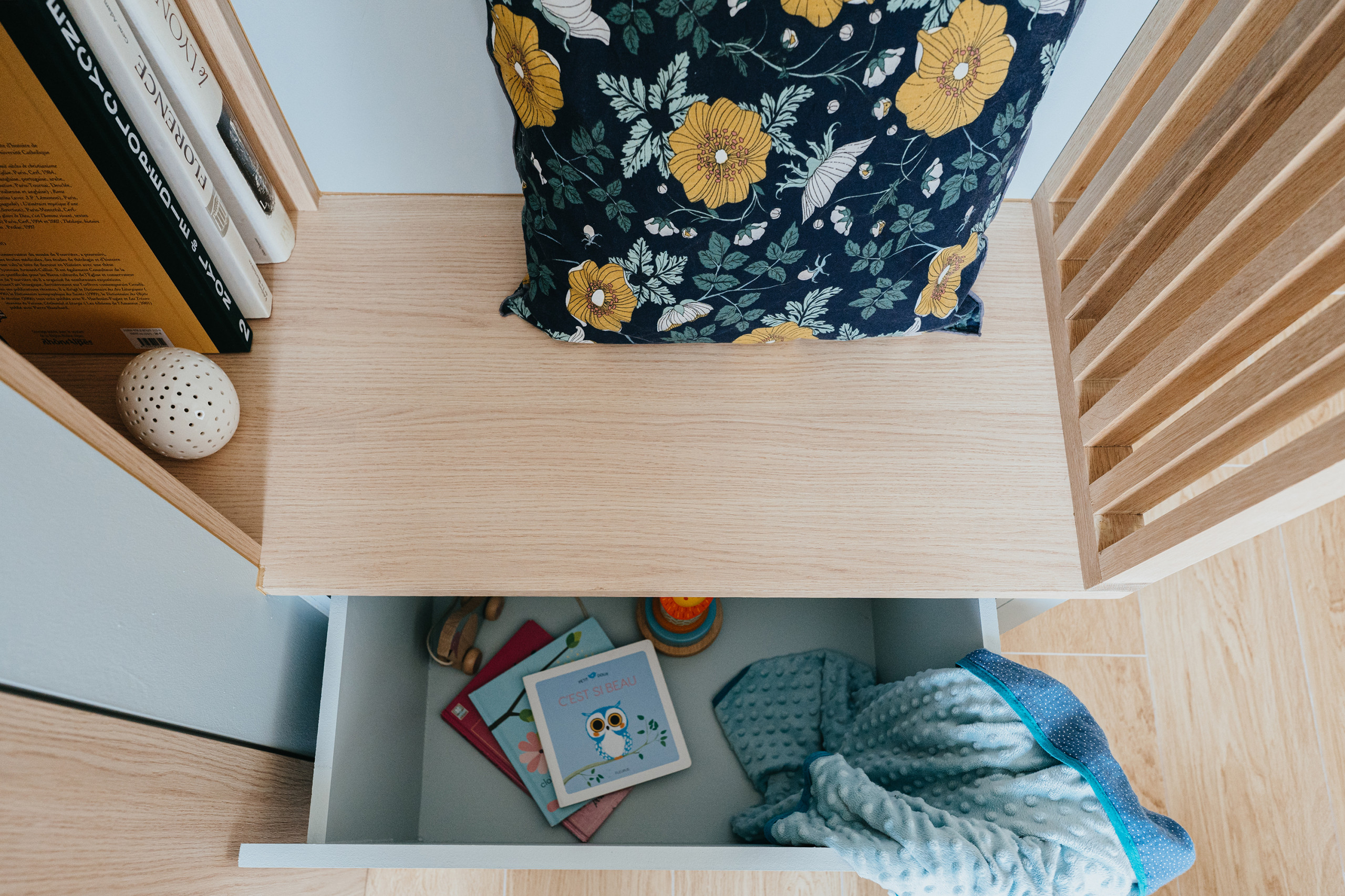 Les petits-enfants ont même une case sous la banquette pour pouvoir ranger leurs jouets tout seuls comme des grands. « C’est vrai que depuis que j’ai deux enfants, je ne vois plus l’architecture pareil et cela donne des idées d’amélioration. Chaque chantier et chaque expérience de vie nous enrichit », philosophe la professionnelle.