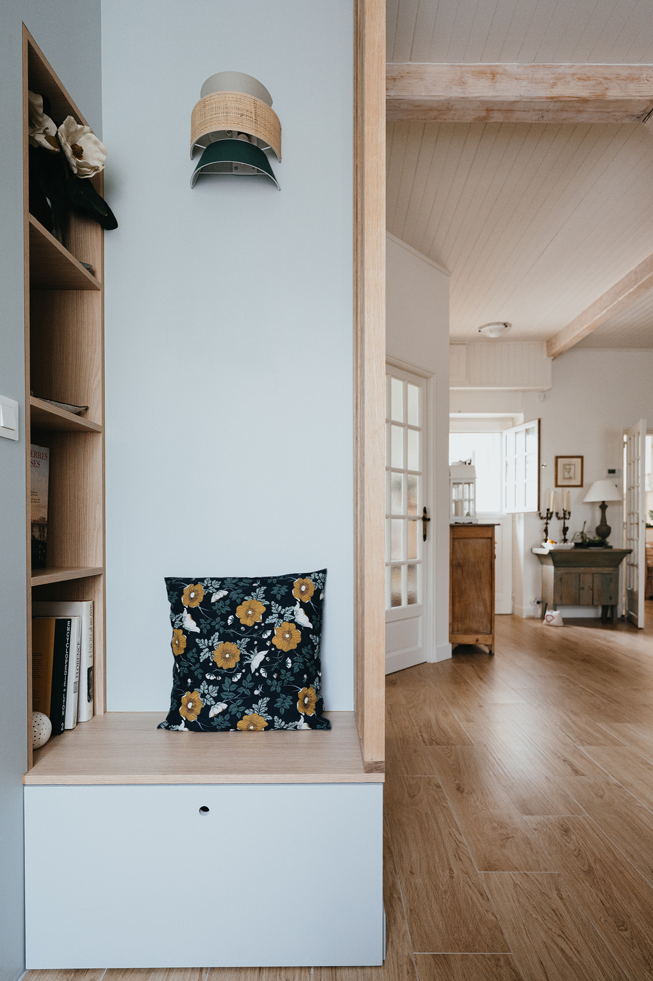 Le problème des propriétaires fut vite identifié : juste à gauche de l’escalier se trouvait la porte des toilettes donnant directement sur le séjour. Par ailleurs, ils lui ont confié leur envie de remplacer leur grande armoire de famille par des rangements toute hauteur.
