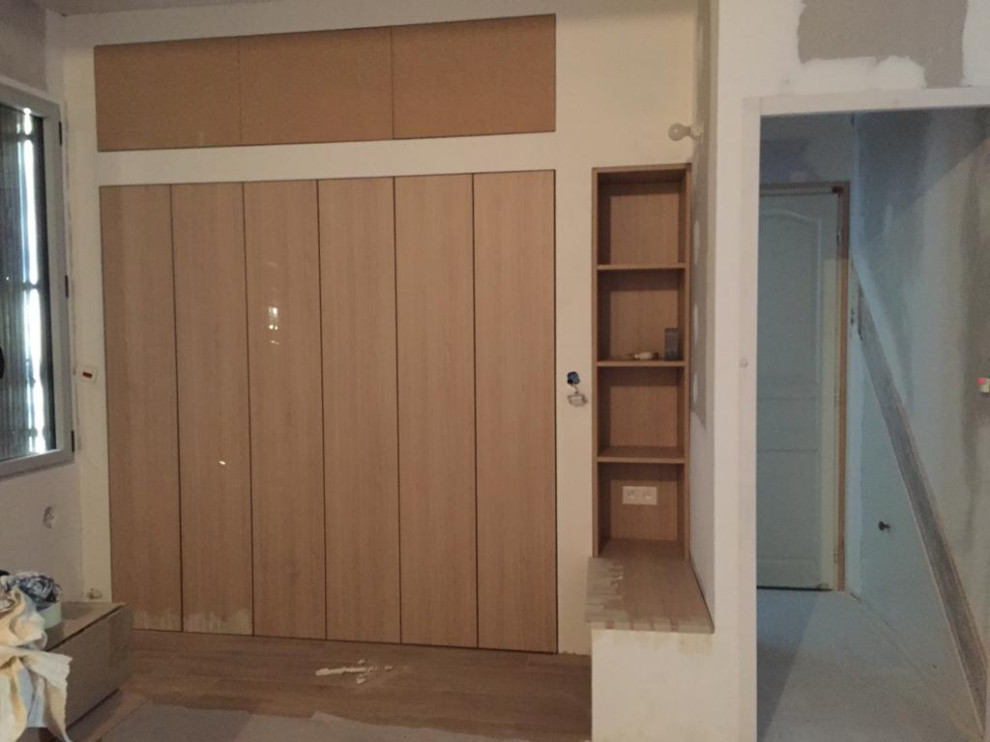 Le rangement du séjour en construction avec la pose des portes plaquées chêne sans poignées.
