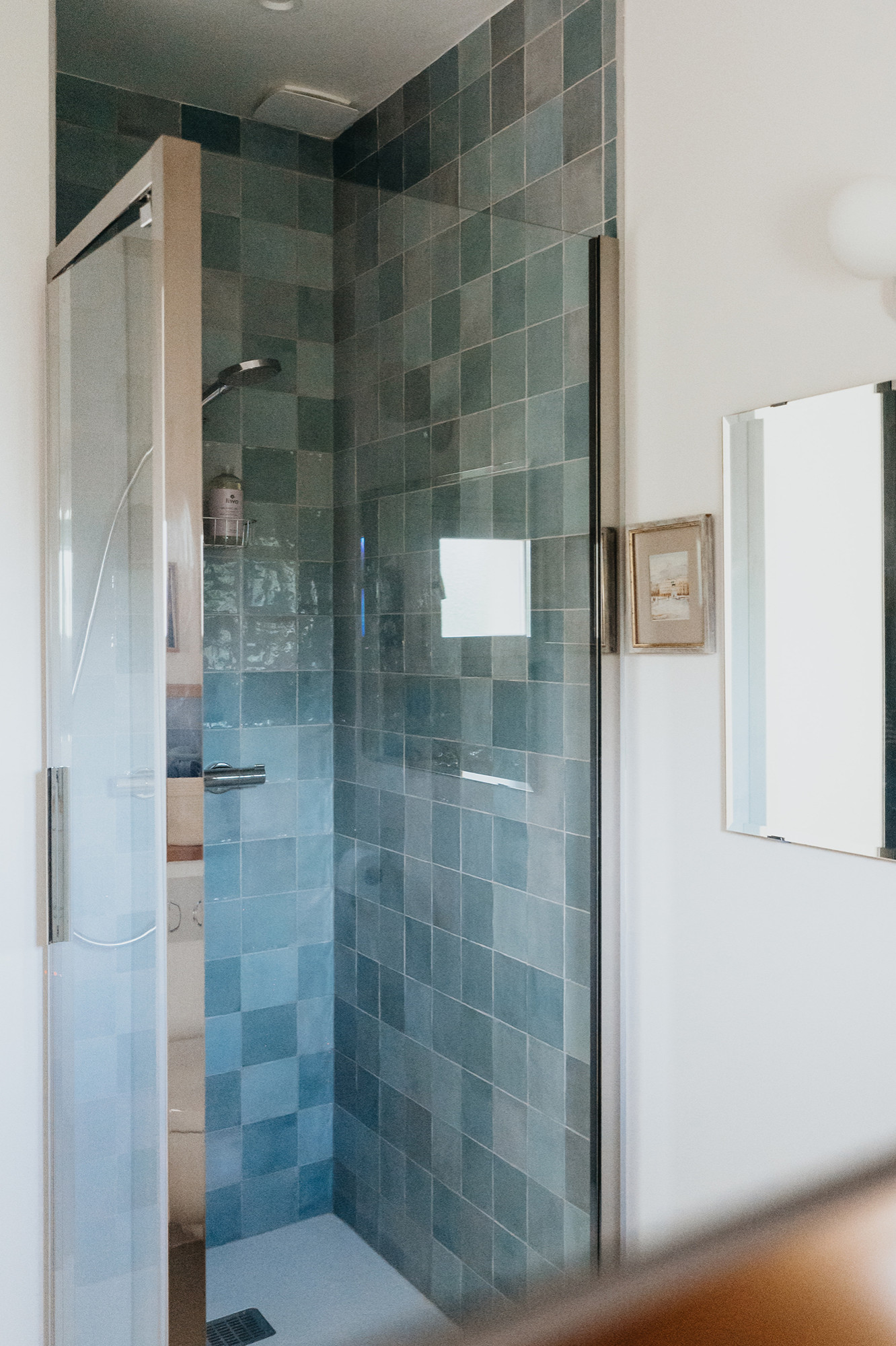 L’opération a même dégagé de l’espace pour agrandir la douche. Elle a été pavée de zelliges bleu ciel pour rester dans l’harmonie choisie.