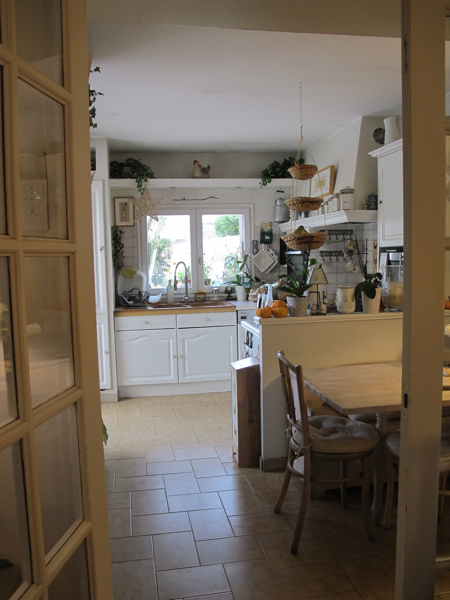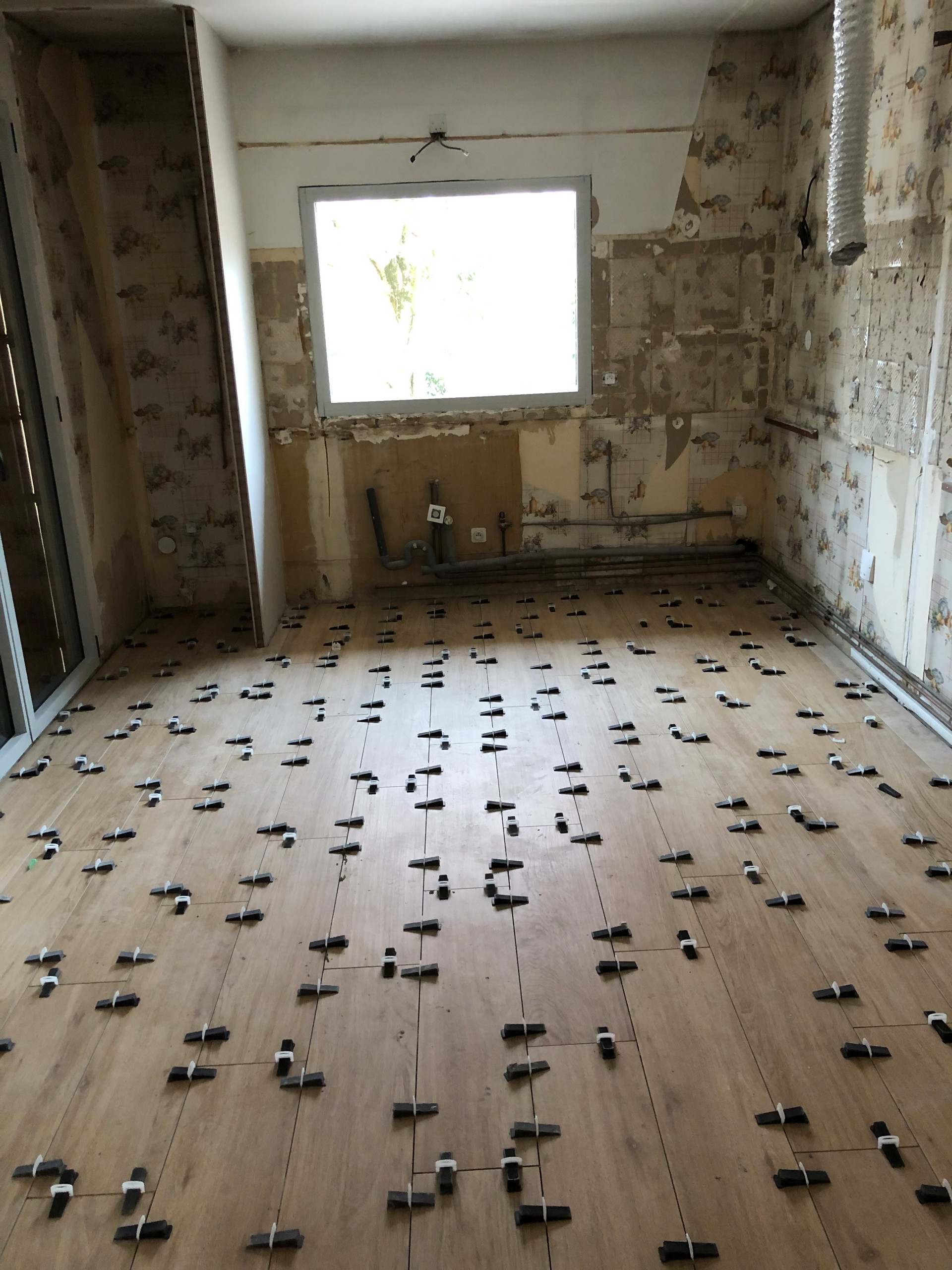 En cours de travaux. La rénovation du sol a nécessité une intervention en profondeur : dépose complète de la cuisine, ragréage, puis pose d’un nouveau carrelage effet parquet. Face à ce démontage complet, l’entreprise et l’architecte d’intérieur ont naturellement proposé de repenser l’aménagement. Cependant, les propriétaires restaient attachés à leur cuisine, tant pour sa configuration pratique que pour la qualité de ses meubles, promis encore à de belles années. Une réflexion s’est donc engagée pour identifier des interventions ciblées qui permettraient de moderniser l’ensemble tout en préservant ses atouts.