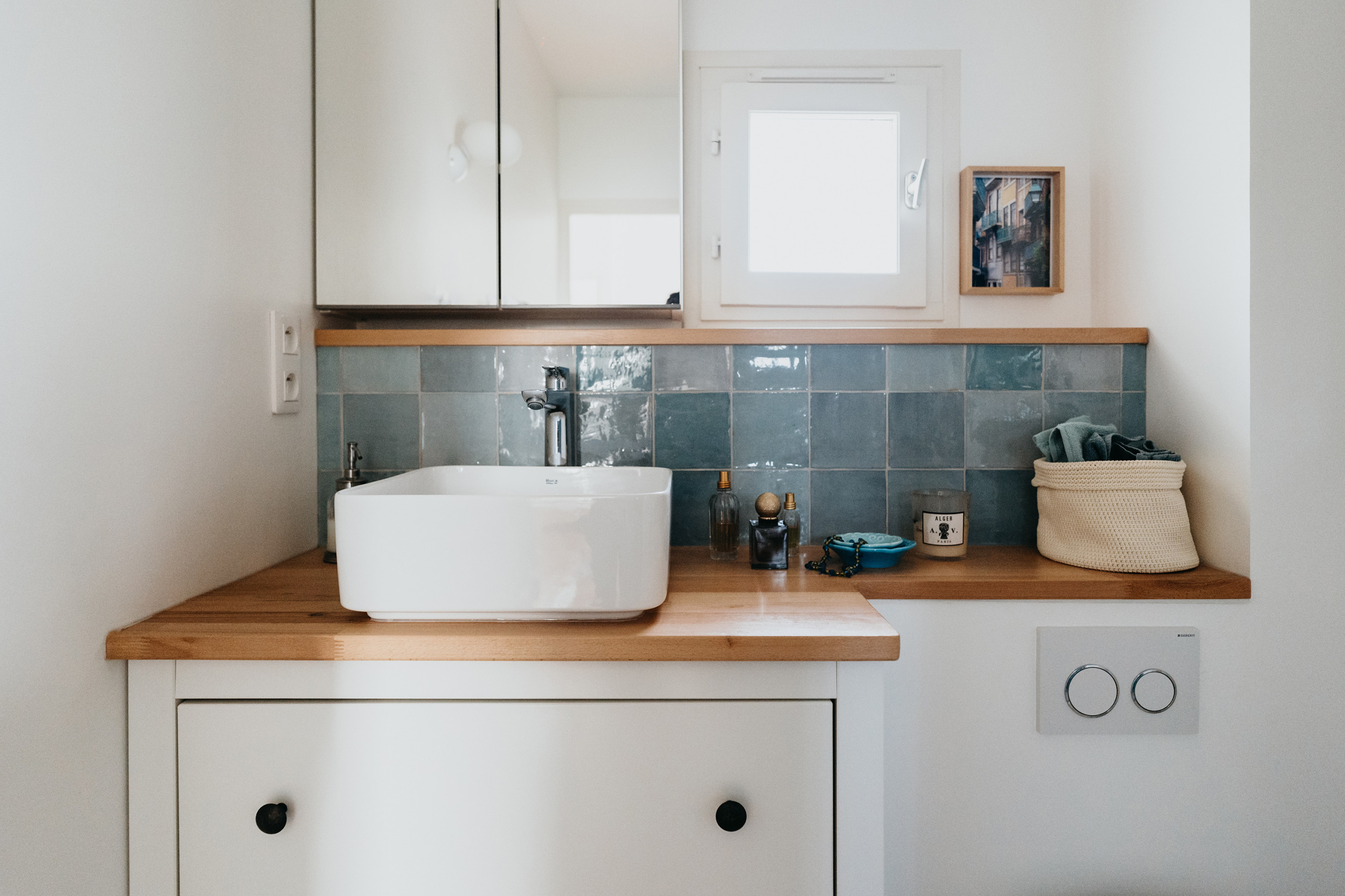 La mise aux normes de la ventilation s’est également imposée comme une priorité. « À l’origine, la pièce ne disposait que d’une simple grille de ventilation naturelle », explique la professionnelle. Une VMC a donc été installée pour assurer un renouvellement d’air constant dans la salle de bains et éviter que l’humidité ne stagne. « Le moteur a été déporté dans le grenier pour limiter les nuisances sonores », précise-t-elle.