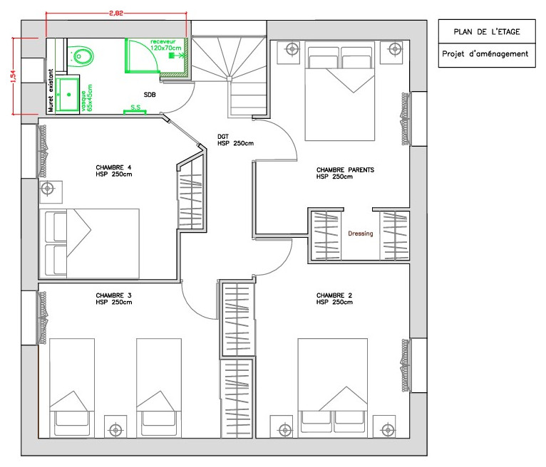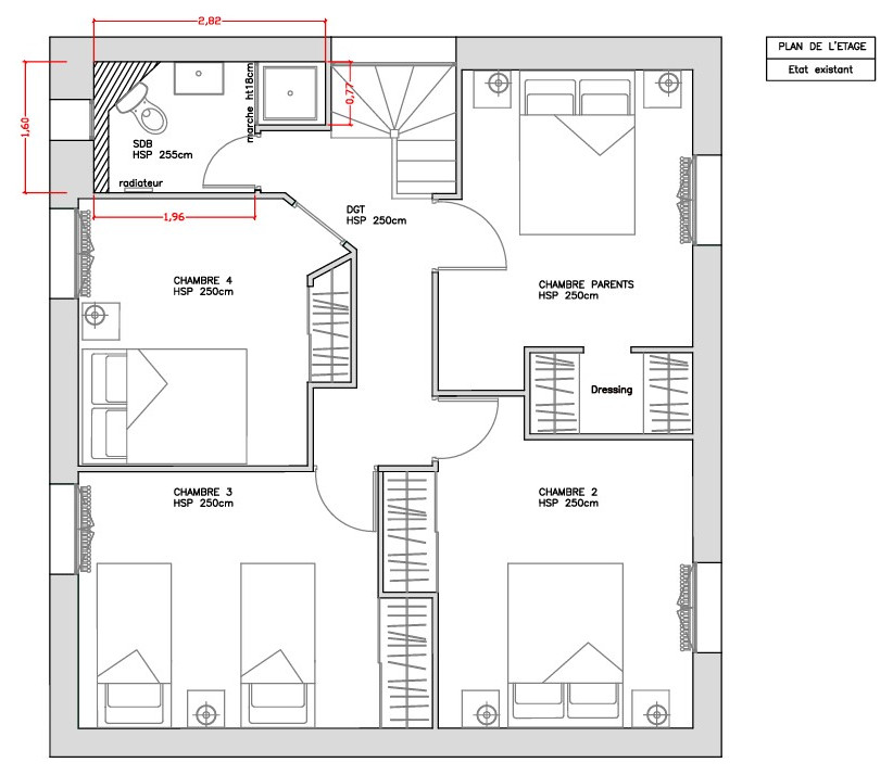 Avant. La rénovation s’est également étendue à la salle de bains de l’étage, où les problèmes d’humidité similaires devaient être traités. L’état des lieux a révélé la présence de toilettes installées sur un imposant coffrage d’angle, comme le montre le plan de l’étage.