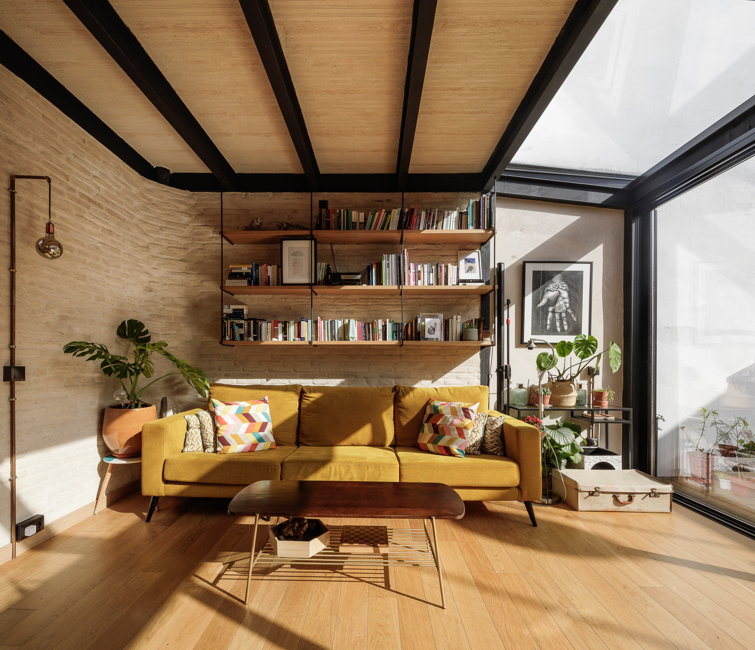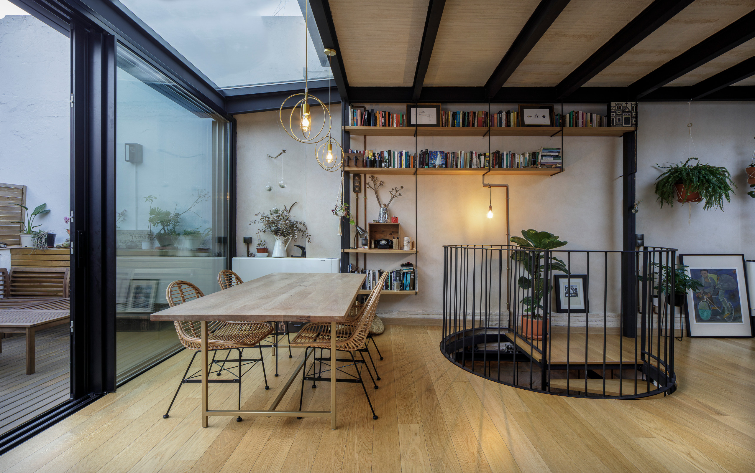 Les propriétaires aiment passer du temps au dernier étage (photo), aménagé façon loft, en raison de sa belle luminosité. On y trouve la cuisine, le salon et la terrasse, dont la famille profite au quotidien.