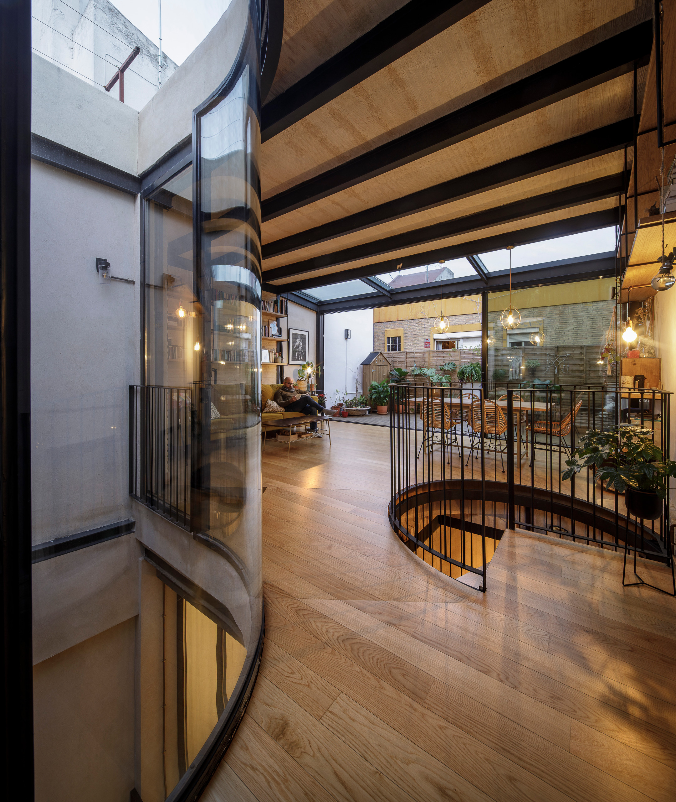 Après. La cour, entourée de ses verrières, est le fil rouge de la maison. Elle relie en effet les trois niveaux visuellement et à la lumière de pénétrer à tous les étages.