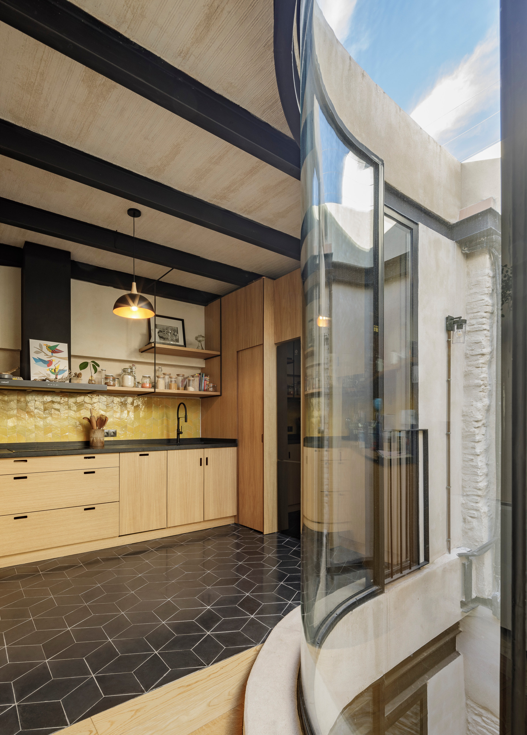 La cuisine est en chêne contreplaqué, avec des plans de travail en basalte naturel, dans une finition mate. La crédence est en faïence artisanale. Le carrelage noir au sol contraste joliment avec le chêne des façades du mobilier.
