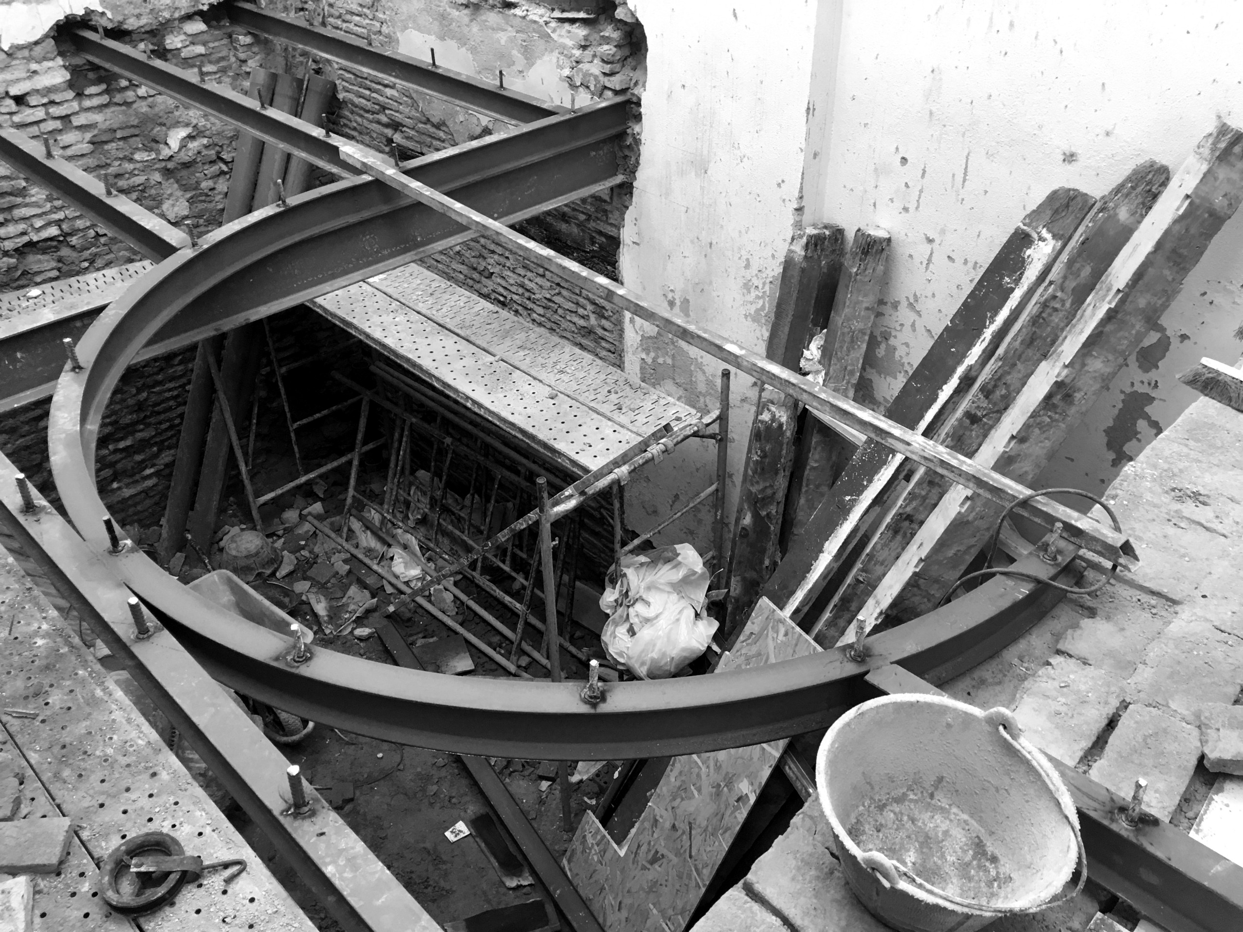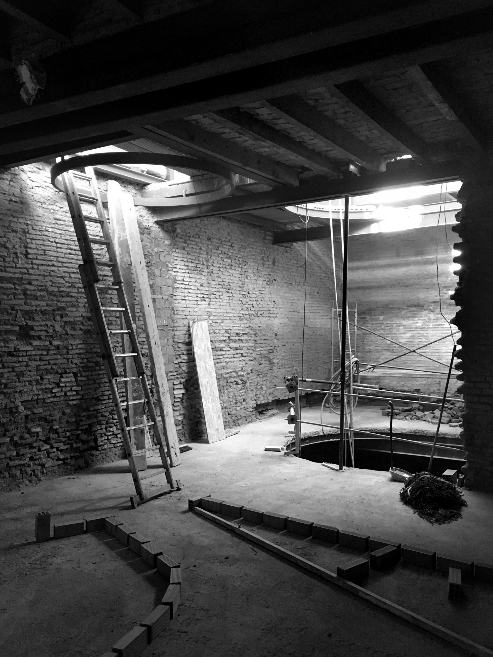 Avant. L’escalier et la cour intérieure constituent les deux pépites architecturales de la maison. « Il s’agissait d’un projet particulièrement complexe, notamment avec la présence de cette cour intérieure, fermée à chaque étage par deux pans de verre incurvés », explique Marta Gómez. « Nous avons cherché à exploiter au maximum la hauteur sous plafond pour faire entrer la lumière. C’était indispensable pour tirer parti du plein potentiel de la maison et créer une vraie connexion entre toutes les pièces. »
