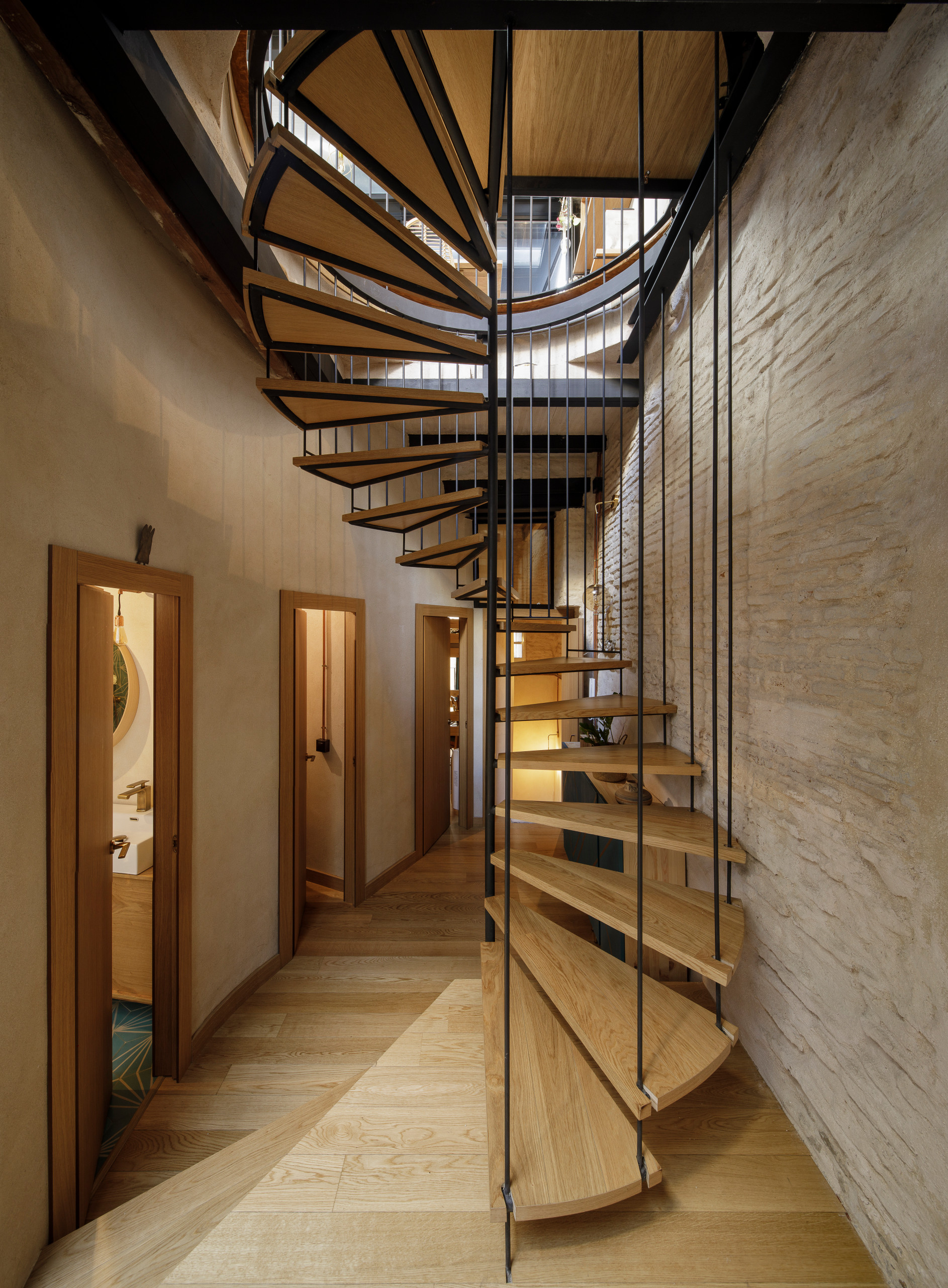 Le choix de l’écoresponsabilité ne sacrifie rien aux splendeurs architecturales de cette bâtisse, avec son puits de lumière sur trois niveaux et son grand escalier en spirale. Les propriétaires de cette maison située dans le cœur historique de Séville, en Espagne, ont soumis leur demande aux architectes de chez EovaStudio : diviser le bâti en deux logements. Ils ont ainsi pu mettre le rez-de-chaussée en location et s’installer aux deux étages supérieurs, tout en préservant, autant que possible, l’ADN du bâtiment.