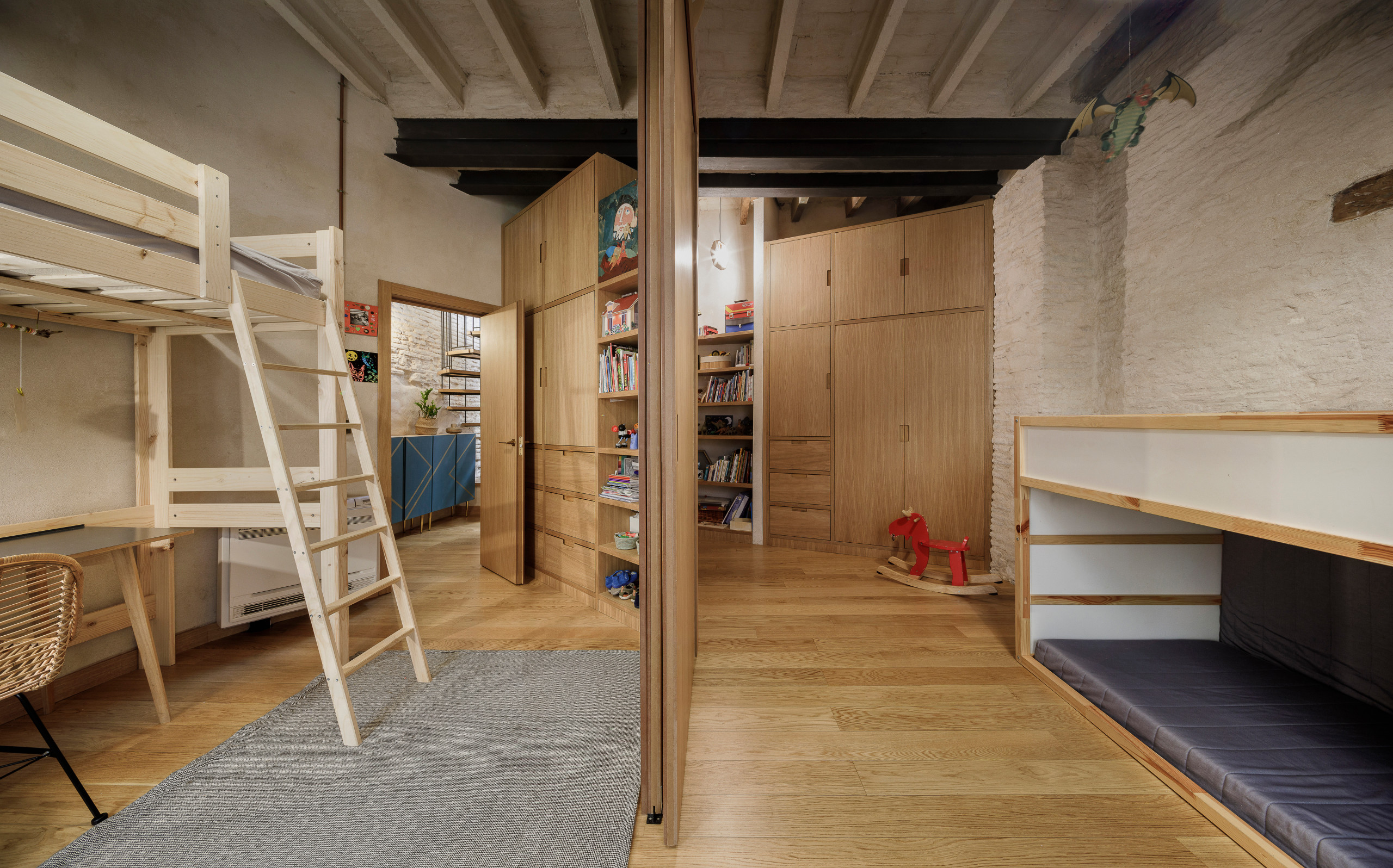 Dans les chambres, le mobilier a principalement été réalisé en bois et sur mesure.