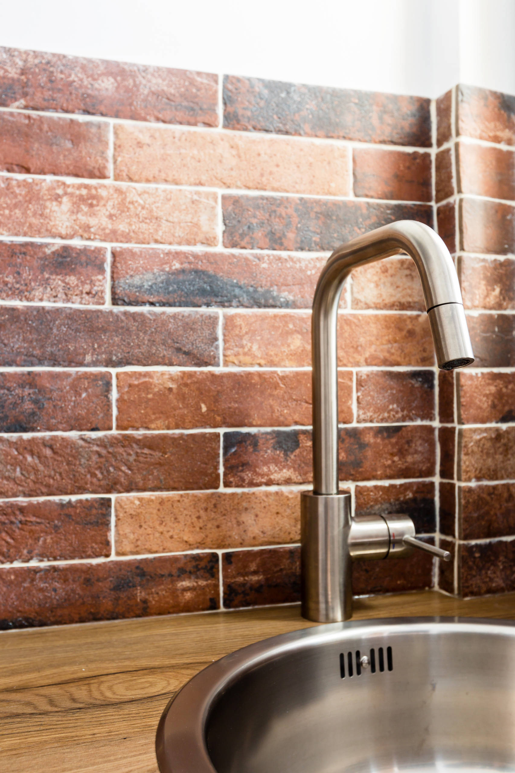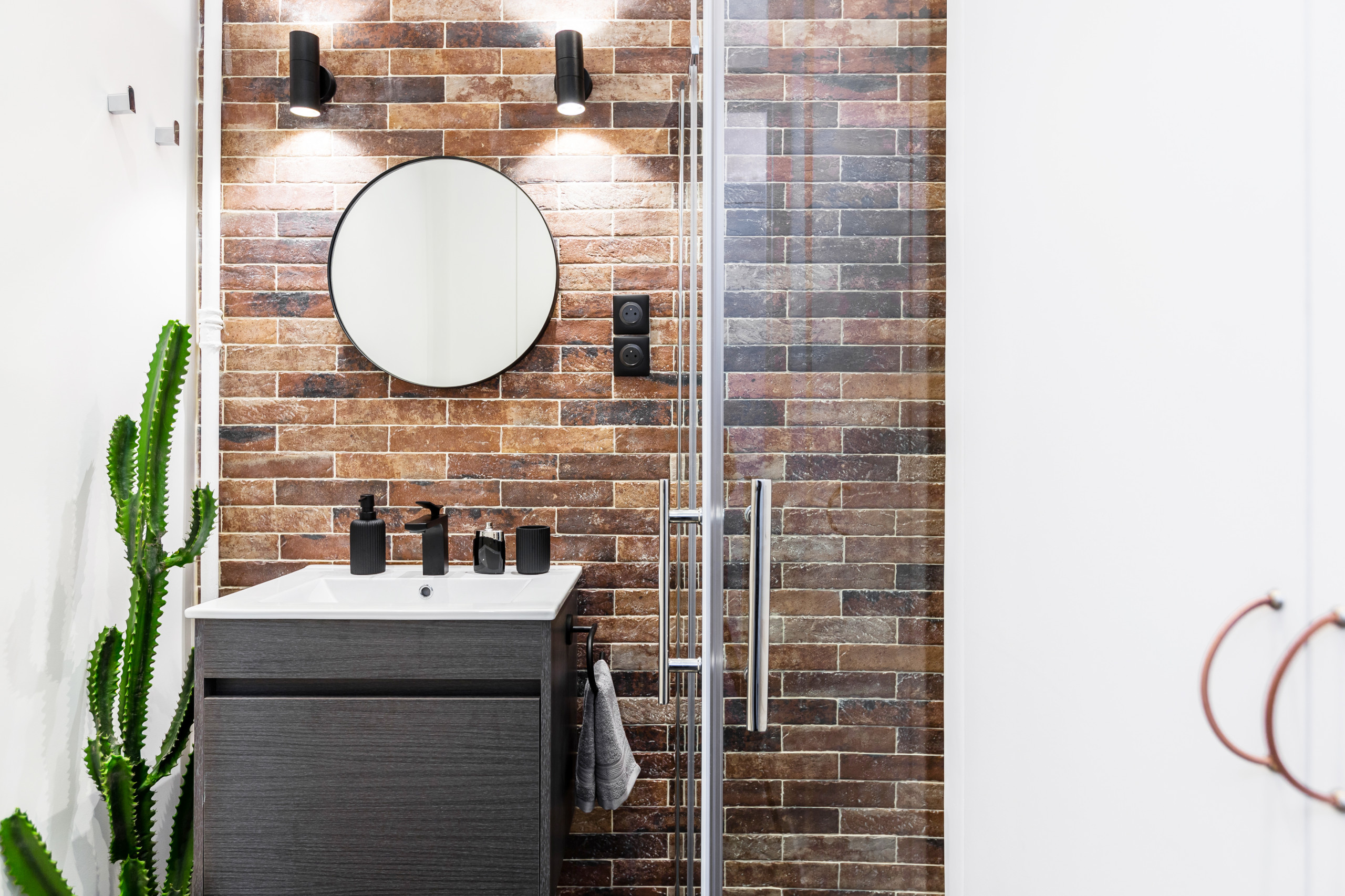 Le mur du fond, en prolongement du mur de briques de la pièce de vie, a été carrelé en parement comme la crédence pour rester dans la thématique loft. Des appliques métalliques éclairant en haut et en bas (« des modèles outdoor pour coller aux normes d’étanchéité ! ») donnent à l’ensemble une belle apparence.
