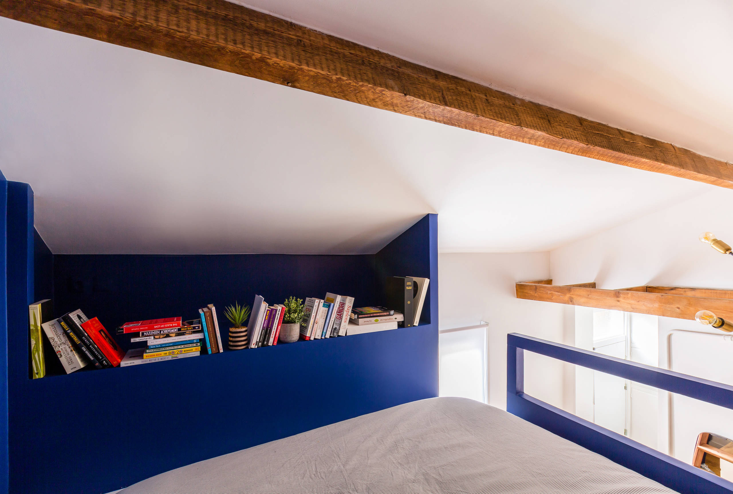 Au pied du lit, la niche créée dans le plafond de la cuisine permet de stocker des livres.
