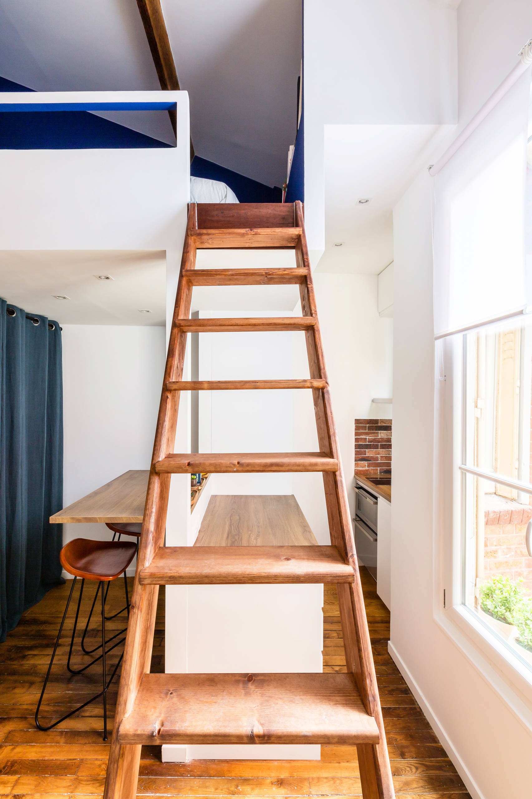 Margaux a donc prévu une échelle de meunier escamotable, que l’on déplace de nuit au milieu de la pièce, dans le prolongement du plan de la cuisine. Afin qu’elle soit aussi confortable qu’un escalier, elle l’a choisi avec de larges marches : « L’entreprise qui s’est chargée des travaux s’est procurée cette échelle standard et a retaillé toutes les marches, qui étaient trop larges. Comme l’échelle était en pin, une essence très claire, elle l’a teintée façon chêne pour qu’elle s’intègre dans le projet », explique la professionnelle.