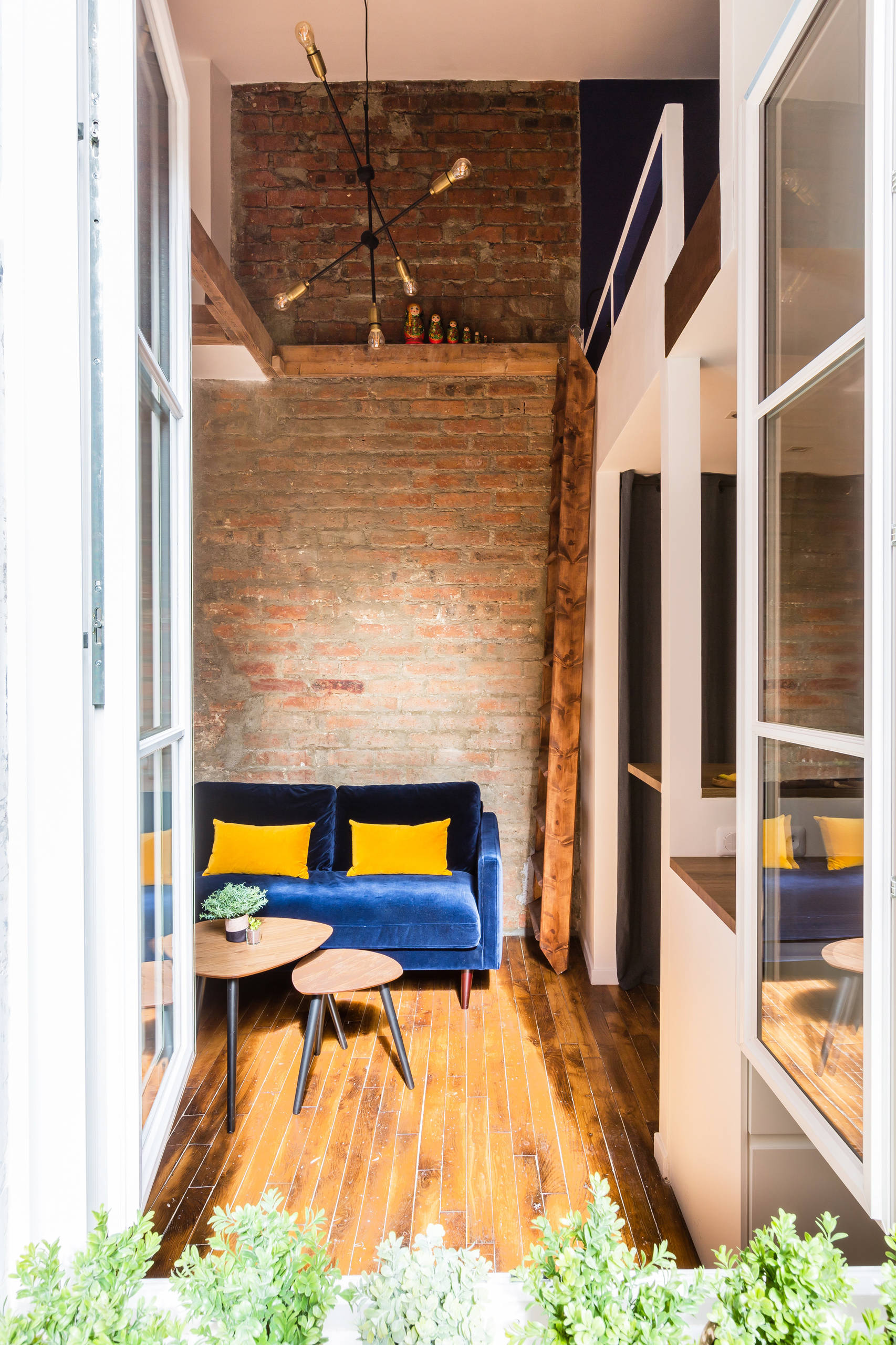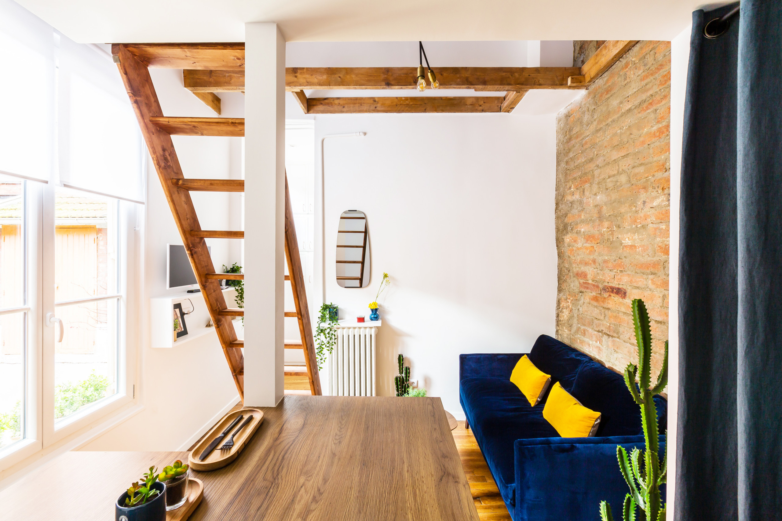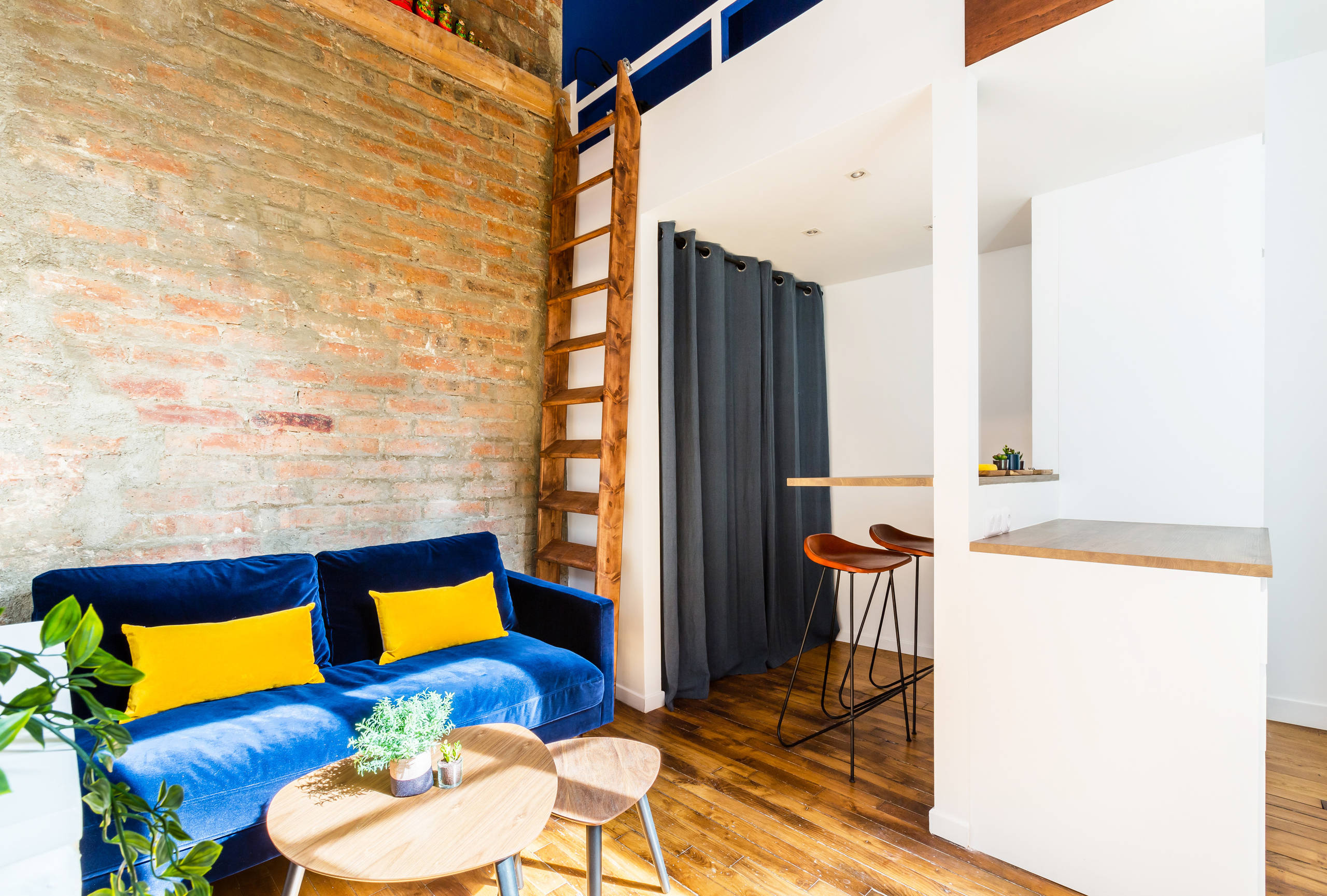 À Vincennes, quand ce couple de trentenaires découvre cette petite maison ouvrière en fond de cour, il espère avoir trouvé le bien idéal pour investir en réalisant une location meublée. La bâtisse de briques ne fait que 19 m² au sol mais son toit à une pente laisse entrevoir la possibilité de récupérer des combles. Il y a néanmoins de quoi douter de la rentabilité de l’opération car la maison, anciennement occupée par une dame âgée, n’est plus habitée depuis longtemps et a connu des problèmes d’étanchéité clairement perceptibles à l’intérieur. Sans tarder, les propriétaires cherchent une professionnelle aguerrie pour les aider à remettre le bien en état et ils contactent Margaux Carnevali dont ils ont repéré sur Houzz les rénovations prometteuses. « Je les ai rassurés d’emblée sur l’état de la maisonnette ainsi que sur les possibilités et, à partir de la prise de contact, il nous a fallu moins de 5 moins pour la transformer en petit loft cosy », explique la professionnelle que nous avons suivie dans la visite des lieux.