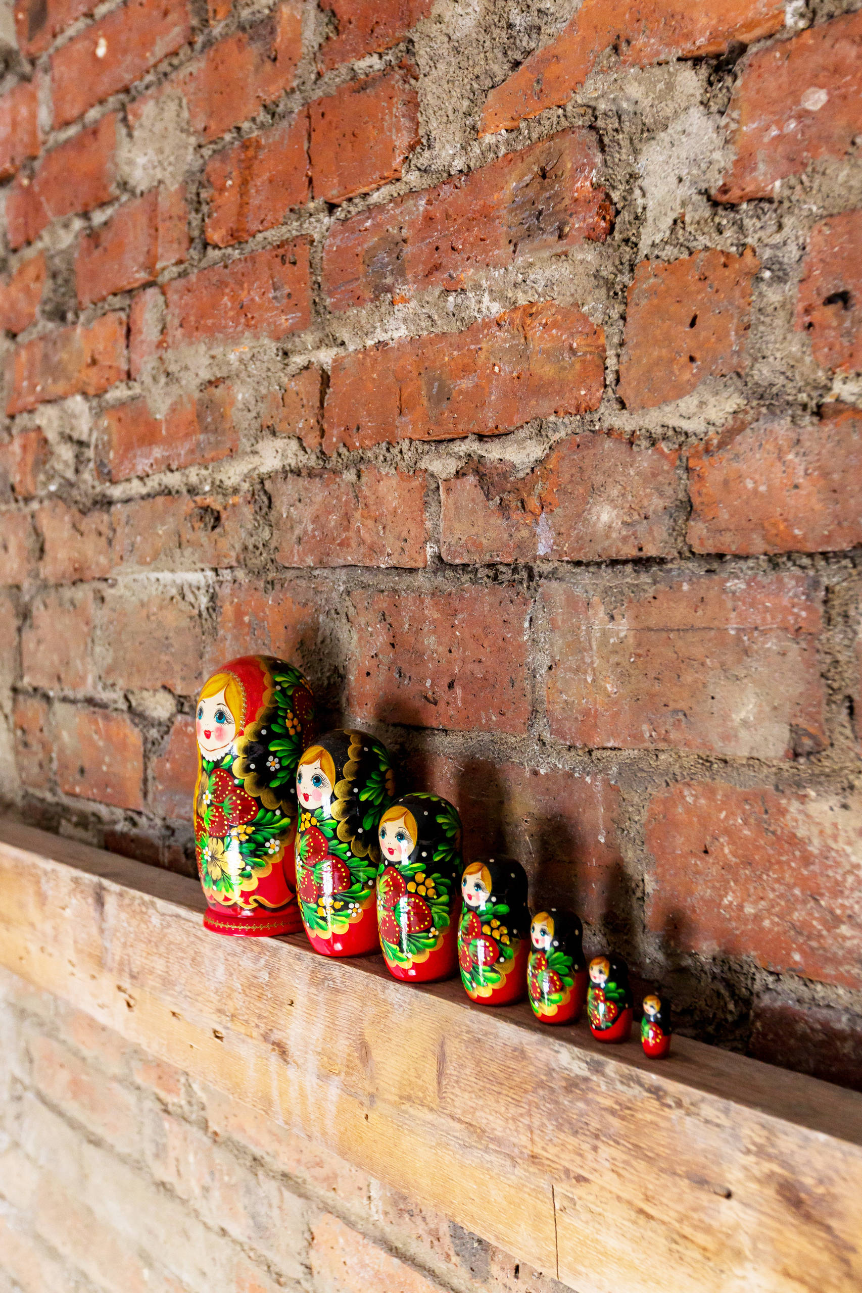 Les propriétaires ont utilisé les poutres visibles de la charpente comme support de déco et y ont installé ces poupées russes.