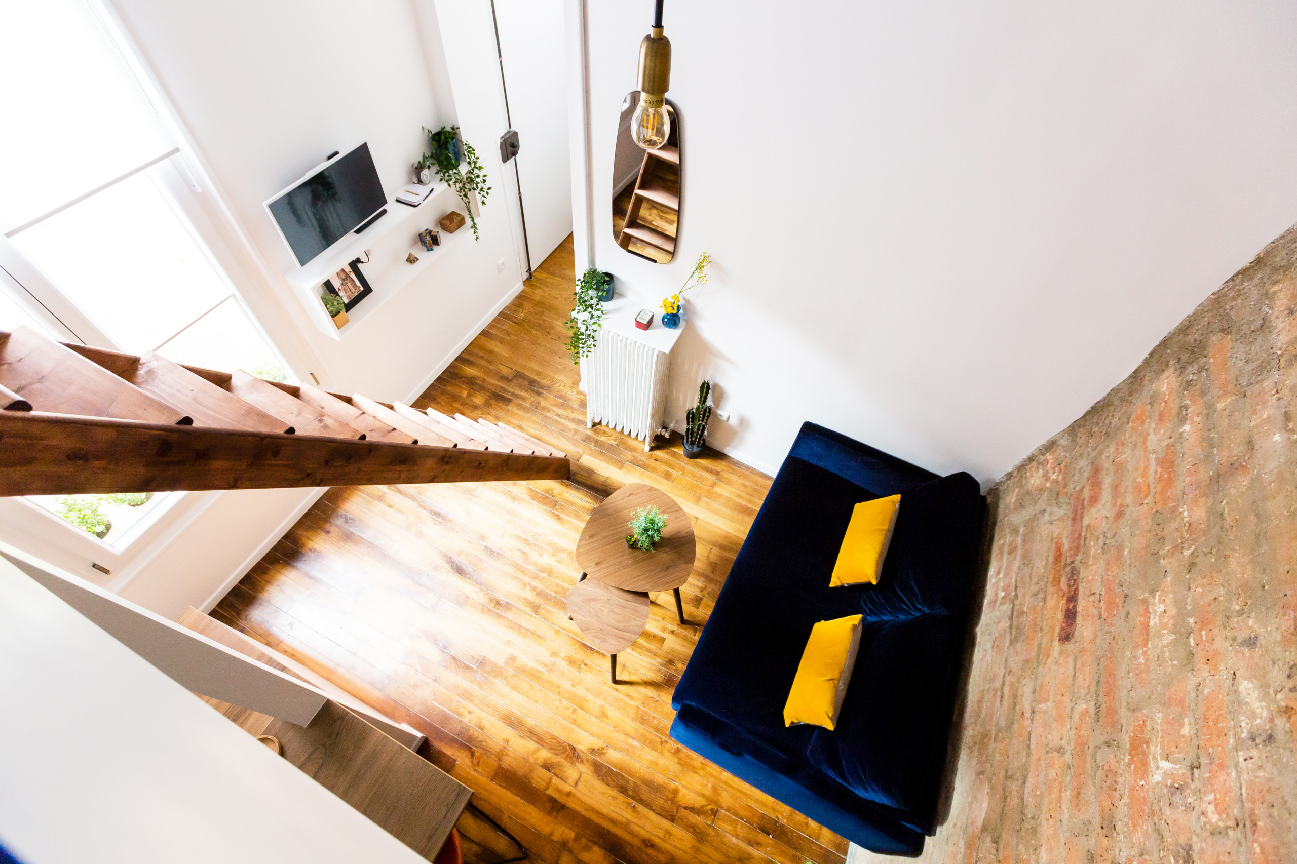 Zoom sur le coin salon depuis la mezzanine. La mise en blanc de la majeure partie de l’appartement a ramené beaucoup de lumière dans la maisonnette située pourtant en fond de cour. Les briques et le sol en chêne ancien apportent charme et authenticité.