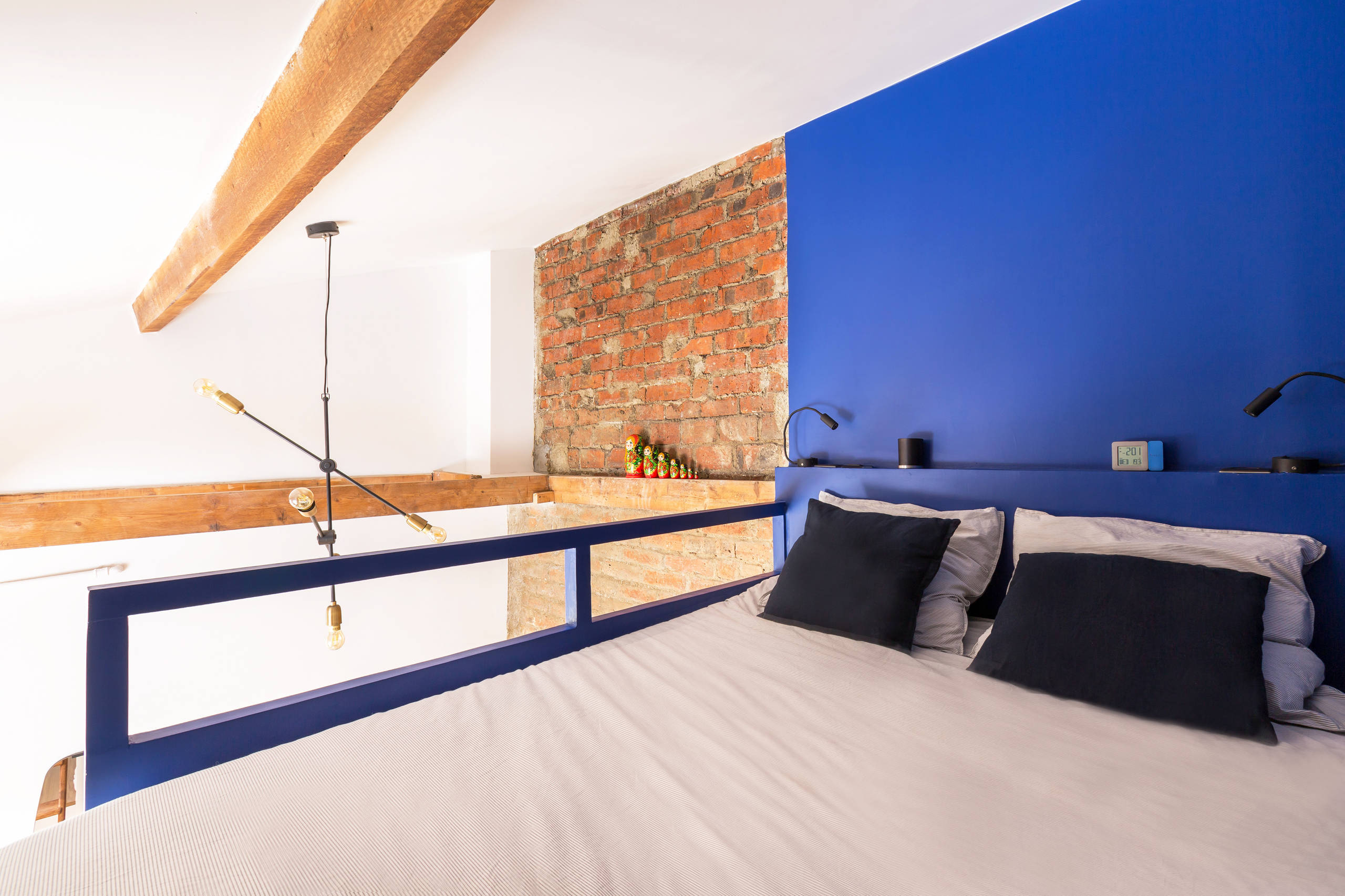 En haut de la mezzanine construite entièrement en bois, un matelas de 140 x 200 a été posé à même son plancher tandis qu’un garde-corps protège des chutes. Côté tête de lit, une menuiserie en medium forme une tête de lit, équipée de liseuses et de prises. Un bleu Klein pare l’alcôve.