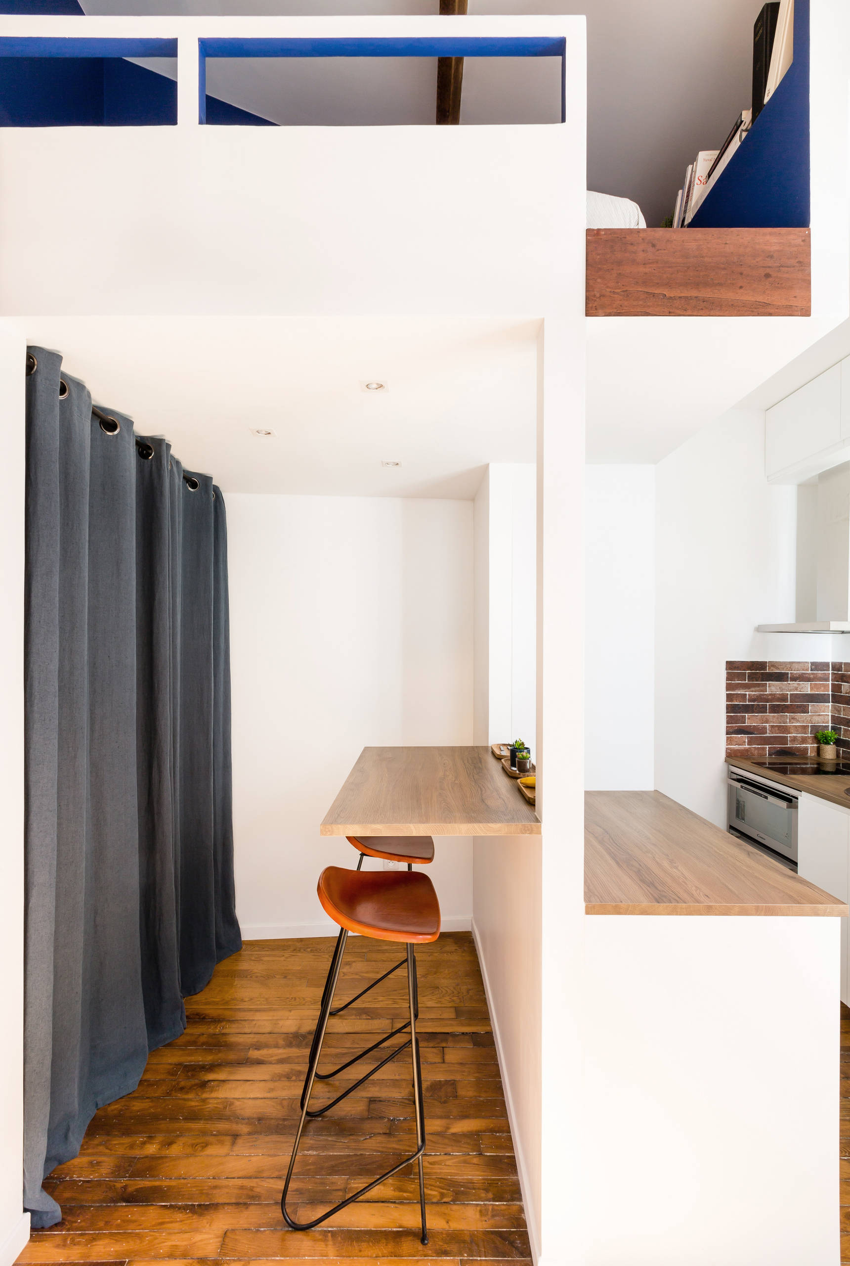 Margaux Carnevali nous explique son cheminement : « Nous avons décloisonné le volume cuisine et envisagé un coin chambre en mezzanine, placé le plus haut possible (à 2,30 m) pour passer confortablement dessous et y loger le coin salle à manger. Impossible de faire aller la mezzanine d’un côté à l’autre de la pièce en raison de la fenêtre… Nous avons donc adapté sa taille à un lit de 140 x 200. Pour ne pas perdre de place au niveau du pied de la mezzanine, nous avons fait remonter le plafond côté cuisine pour éviter la fenêtre, mais en y dissimulant une niche accessible depuis le lit. »